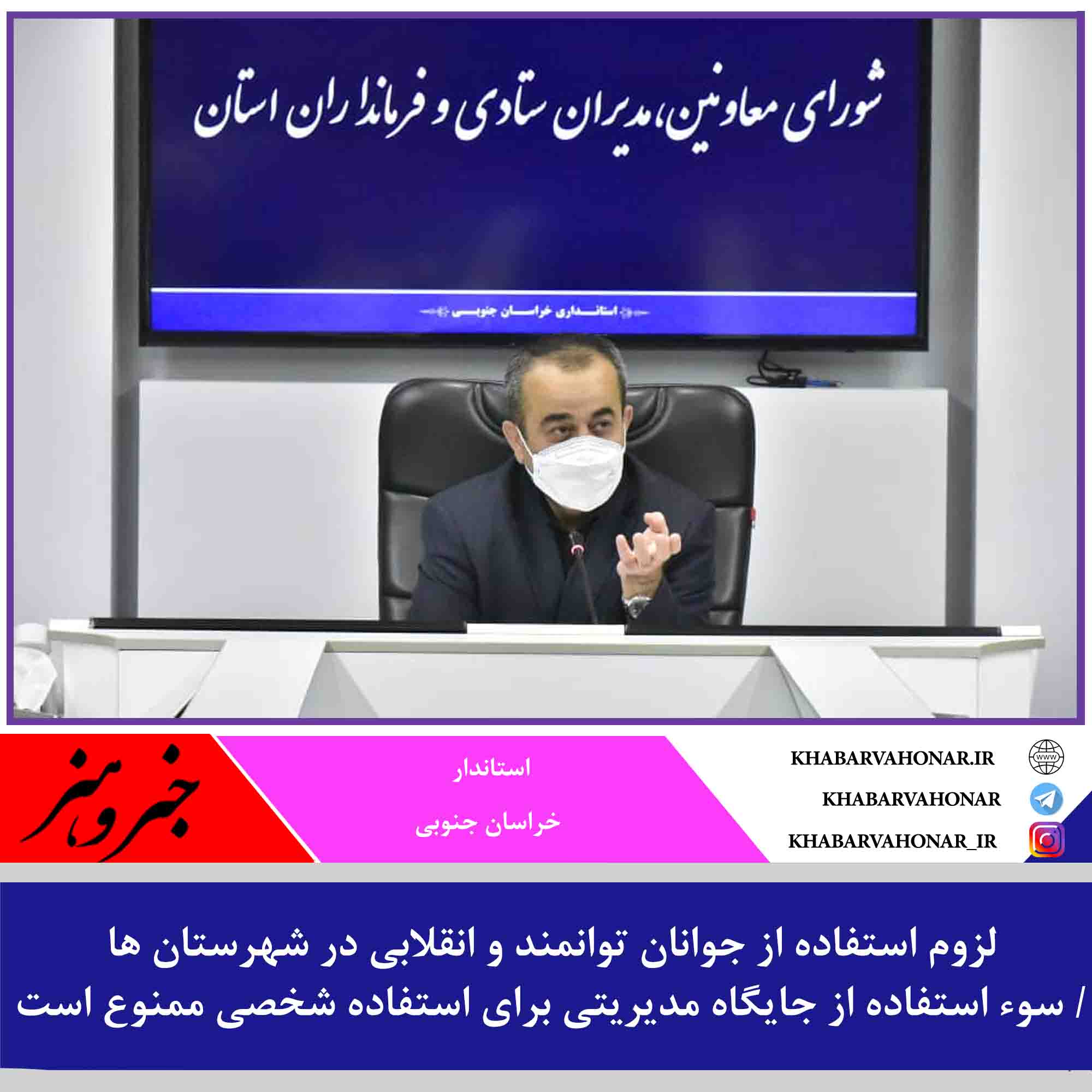 استاندار خراسان جنوبی با اشاره به اینکه فرمانداران باید همراه با خانواده در محل خدمت باشند، تأکید کرد: مدیران اجرایی شهرستان ها باید بهمراه خانواده در محل خدمت باشند و فرمانداران این مسئله را پیگیری و مطالبه نمایند.
