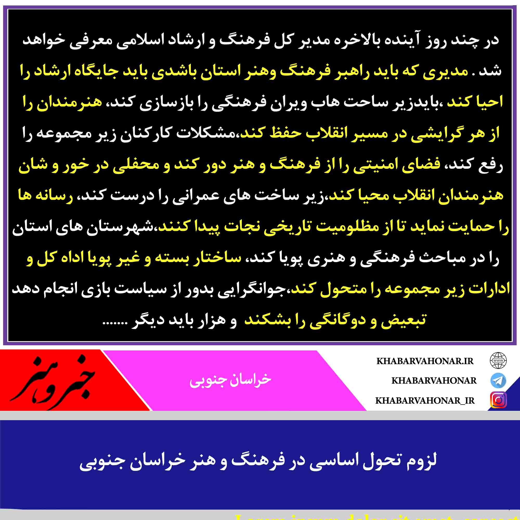 در چند روز آینده بالاخره مدیر کل فرهنگ و ارشاد اسلامی معرفی خواهد شد . مدیری که باید راهبر فرهنگ وهنر استان باشدی باید جایگاه ارشاد را احیا کند ،بایدزیر ساحت هاب ویران فرهنگی را بازسازی کند، هنرمندان را از هر گرایشی در مسیر انقلاب حفظ کند،مشکلات کارکنان زیر مجموعه را رفع کند، فضای امنیتی را از فرهنگ و هنر دور کند و محفلی در خور و شان هنرمندان انقلاب محیا کند،زیر ساخت های عمرانی را درست کند، رسانه ها را حمایت نماید تا از مظلومیت تاریخی نجات پیدا کنند،شهرستان های استان را در مباحث فرهنگی و هنری پویا کند، ساختار بسته و غیر پویا اداه کل و ادارات زیر مجموعه را متحول کند،جوانگرایی بدور از سیاست بازی انجام دهد تبعیض و دوگانگی را بشکند و هزار باید دیگر …….