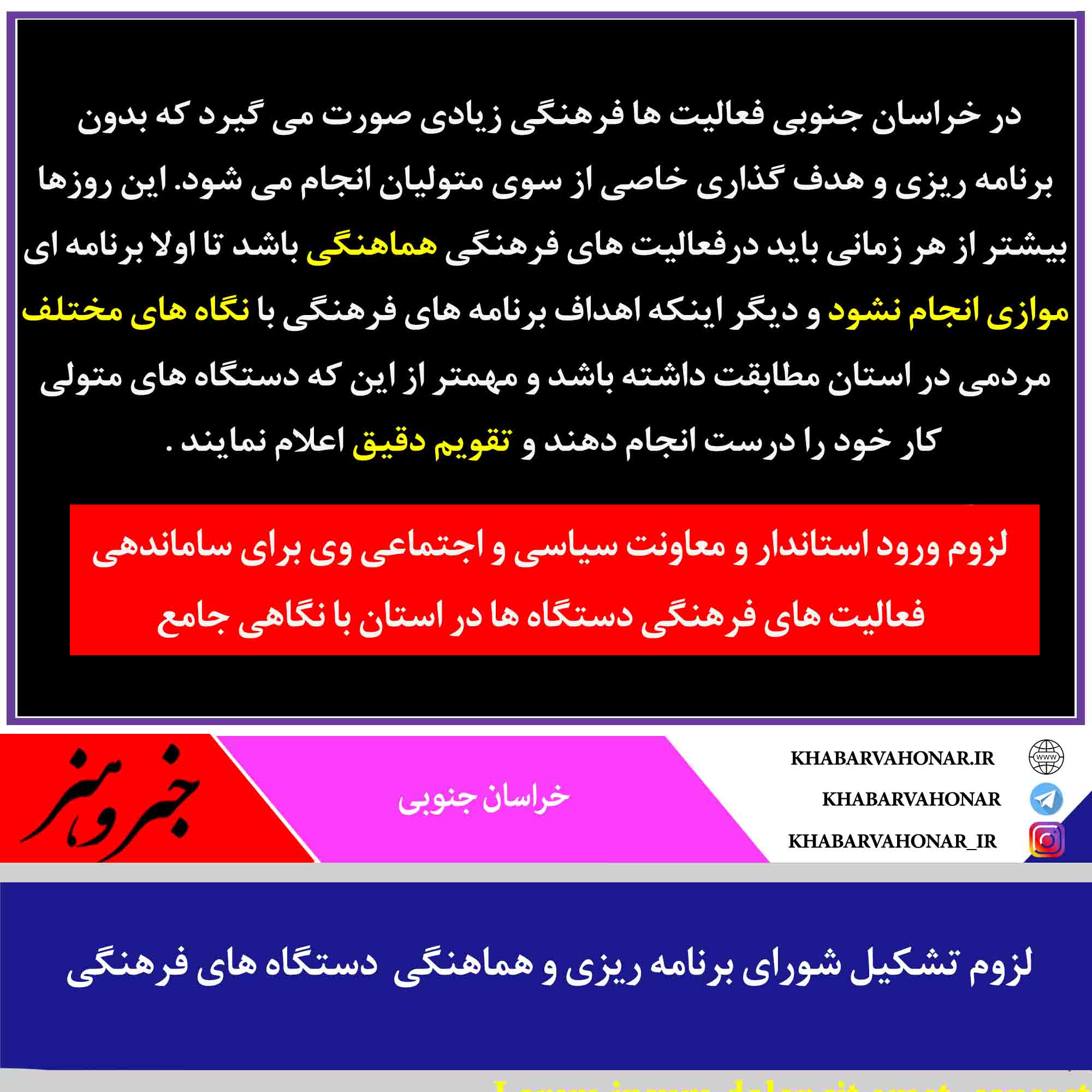 در خراسان جنوبی فعالیت ها فرهنگی زیادی صورت می گیرد که بدون برنامه ریزی و هدف گذاری خاصی از سوی متولیان انجام می شود. این روزها بیشتر از هر زمانی باید درفعالیت های فرهنگی هماهنگی باشد تا اولا برنامه ای موازی انجام نشود و دیگر اینکه اهداف برنامه های فرهنگی با نگاه های مختلف مردمی در استان مطابقت داشته باشد و مهمتر از این که دستگاه های متولی کار خود را درست انجام دهند و تقویم دقیق اعلام نمایند .