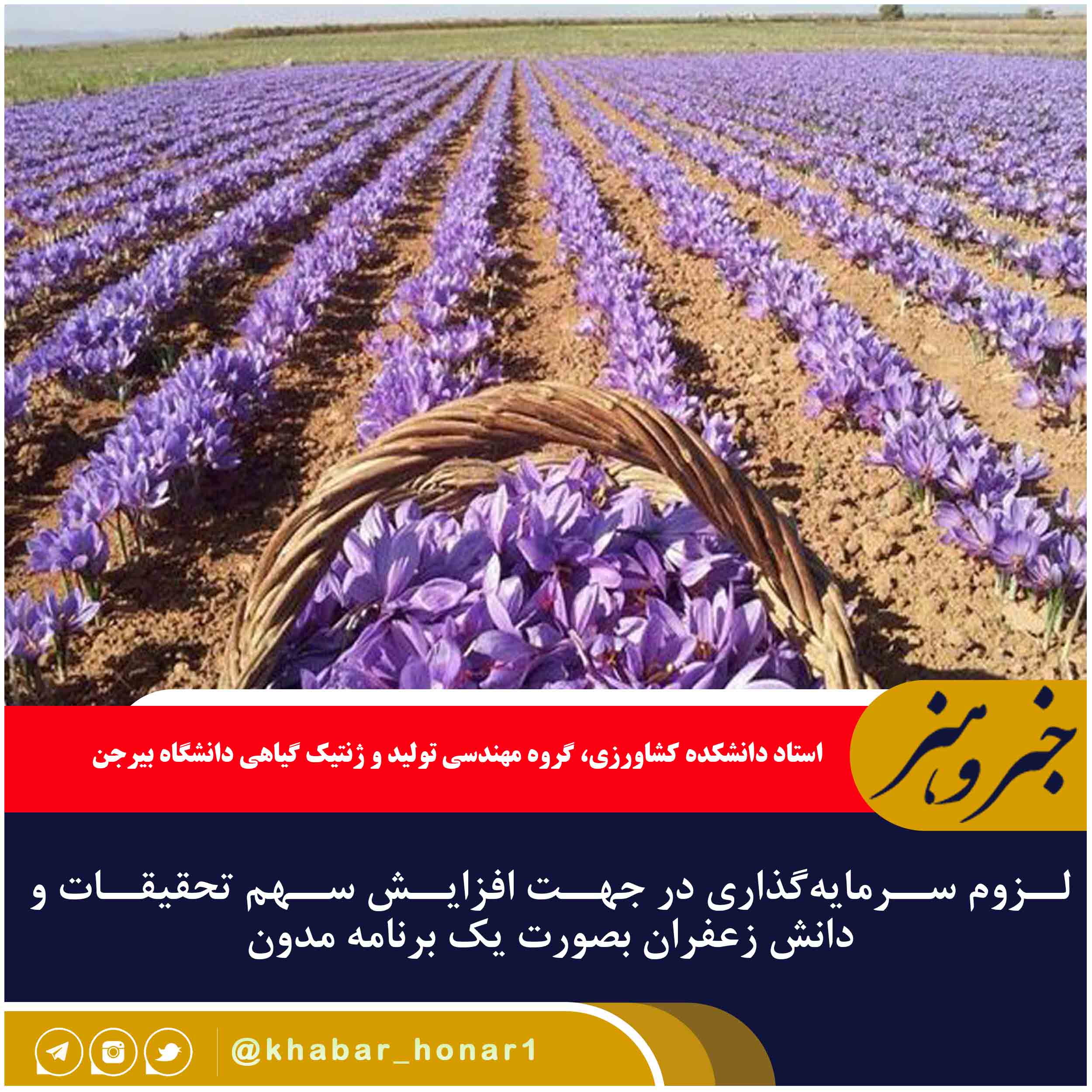 استاد دانشکده کشاورزی، گروه مهندسی تولید و ژنتیک گیاهی دانشگاه بیرجند گفت: لازم است در کشور سرمایهگذاری و برنامهریزی لازم برای افزایش سهم تحقیقات و دانش زعفران بصورت یک برنامه مدون انجام پذیرد تا در آینده پاسخگوی نیازها و توسعه صنعت زعفران باشیم.