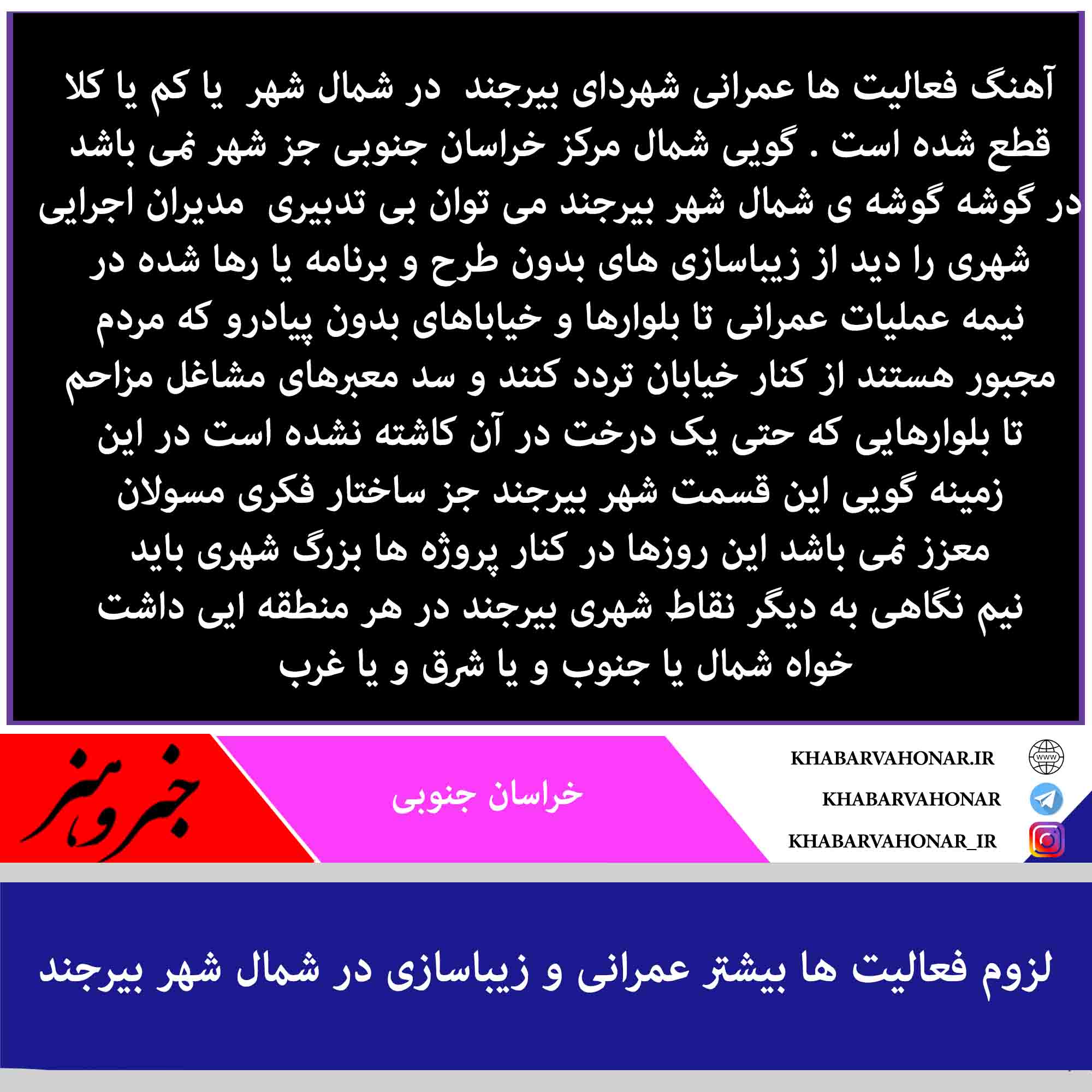 آهنگ فعالیت ها عمرانی شهردای بیرجند در شمال شهر یا کم یا کلا قطع شده است . گویی شمال مرکز خراسان جنوبی جز شهر نمی باشد در گوشه گوشه ی شمال شهر بیرجند می توان بی تدبیری مدیران اجرایی شهری را دید از زیباسازی های بدون طرح و برنامه یا رها شده در نیمه عملیات عمرانی تا بلوارها و خیاباهای بدون پیادرو که مردم مجبور هستند از کنار خیابان تردد کنند و سد معبرهای مشاغل مزاحم تا بلوارهایی که حتی یک درخت در آن کاشته نشده است در این زمینه گویی این قسمت شهر بیرجند جز ساختار فکری مسولان معزز نمی باشد این روزها در کنار پروژه ها بزرگ شهری باید نیم نگاهی به دیگر نقاط شهری بیرجند در هر منطقه ایی داشت خواه شمال یا جنوب و یا شرق و یا غرب