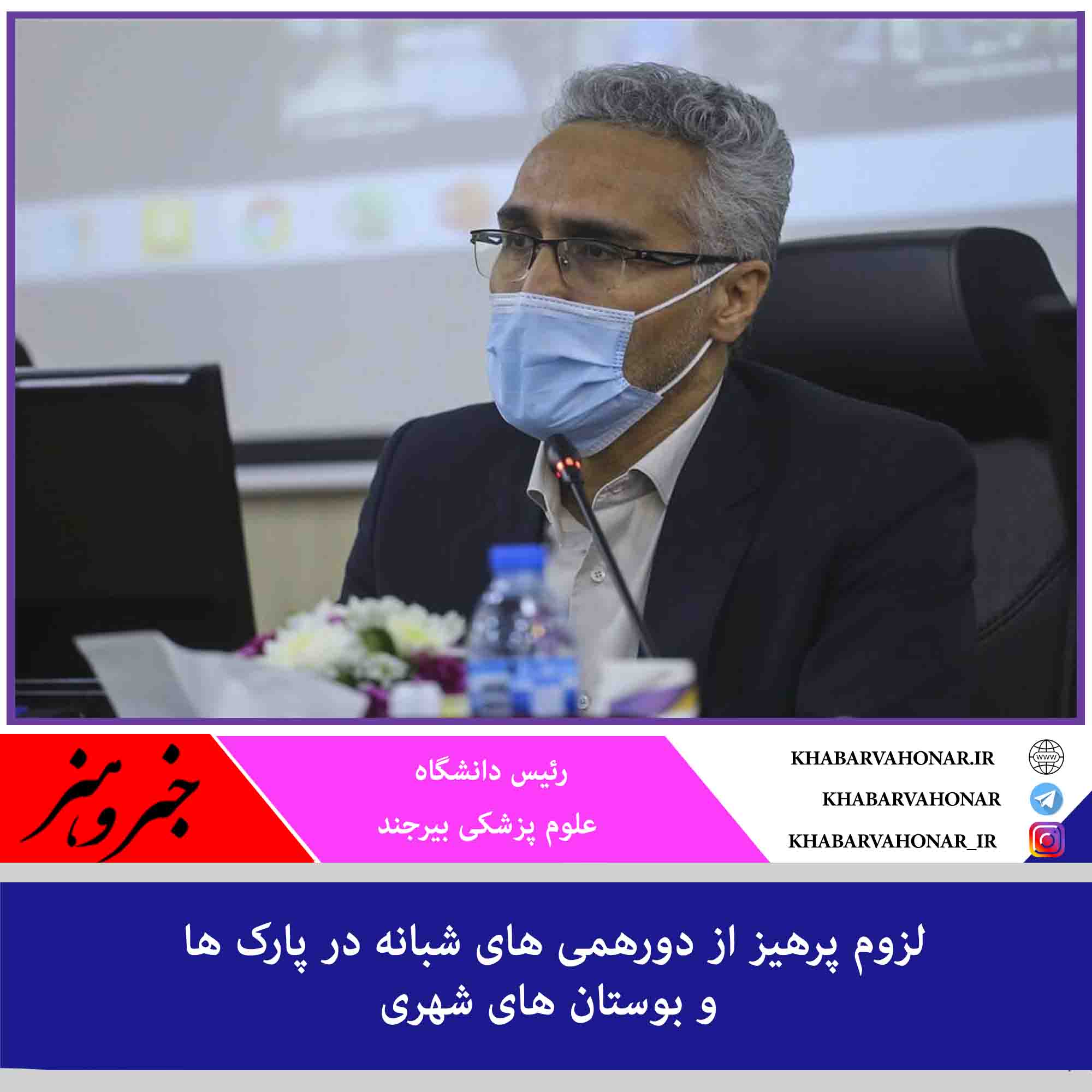 ?دهقانی رئیس دانشگاه علوم پزشکی بیرجند با اشاره به اینکه دورهمی ها نقش مهمی در گسترش شیوع کرونا دارد، گفت: مصوب شده است به منظور حفظ سلامتی جامعه و جلوگیری از شیوع کرونا، از ساعت ۲۱:۳۰ از حضور در پارک ها خودداری شود.