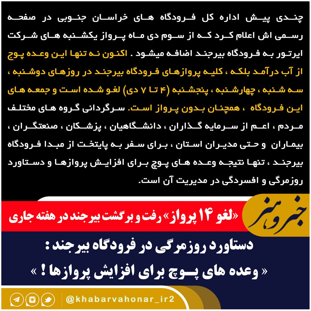 چندی پیش اداره کل فرودگاه های خراسان جنوبی در صفحه رسمی اش اعلام کرد که از سوم دی ماه پرواز یکشنبه های شرکت ایرتور به فرودگاه بیرجند اضافه میشود . اکنون نه تنها این وعده پوج از آب درآمد بلکه ، کلیه پروازهای فرودگاه بیرجند در روزهای دوشنبه ، سه شنبه ، چهارشنبه ، پنجشنبه (۴ تا ۷ دی) لغو شده است و جمعه های این فرودگاه ، همچنان بدون پرواز است. سرگردانی گروه های مختلف مردم ، اعم از سرمایه گذاران ، دانشگاهیان ، پزشکان ، صنعتگران ، بیماران و حتی مدیران استان ، برای سفر به پایتخت از مبدا فرودگاه بیرجند ، تنها نتیجه وعده های پوچ برای افزایش پروازها و دستاورد روزمرگی و افسردگی در مدیریت آن است.