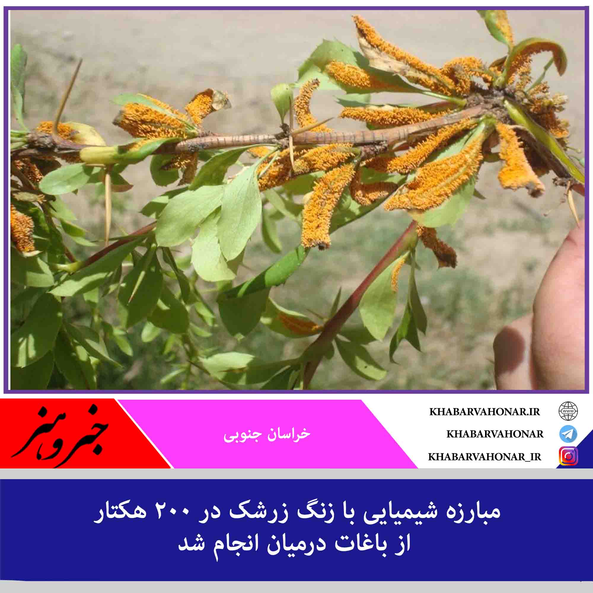 مدیر جهاد کشاورزی درمیان گفت: مبارزه شیمیایی با آفت زنگ زرشک در ۲۰۰ هکتار از باغات این شهرستان در سال زراعی جاری انجام شد و این بیماری با همکاری مردم قابل کنترل است.