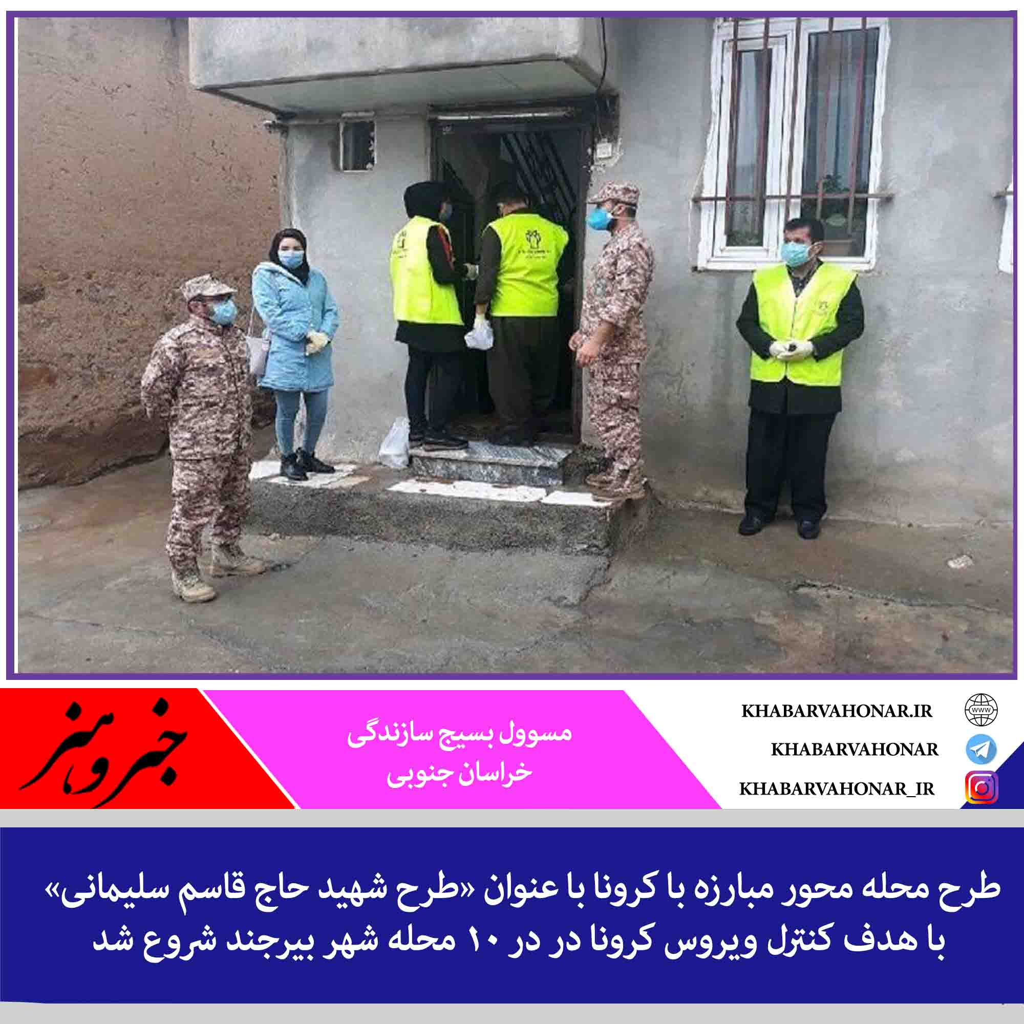 مسوول بسیج سازندگی خراسان جنوبی گفت: طرح محله محور مبارزه با کرونا با عنوان «طرح شهید حاج قاسم سلیمانی» با هدف کنترل ویروس کرونا در در ۱۰ محله شهر بیرجند شروع شد و بهتدریج در سایر نقاط پرخطر استان اجرا میشود.