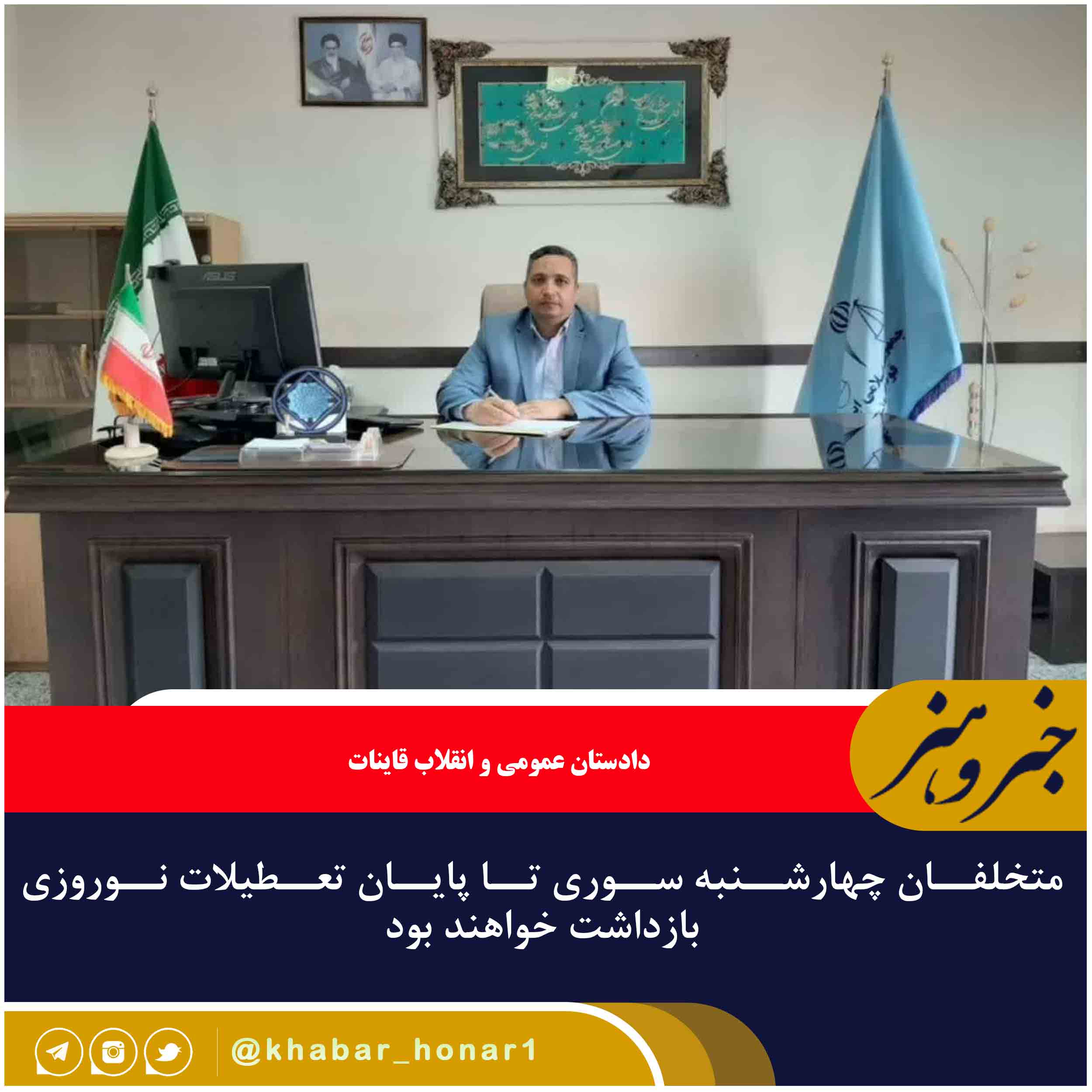 ?دادستان عمومی و انقلاب قاینات با اشاره به فرا رسیدن چهارشنبه آخرسال، گفت: به منظور برخورد با عوامل بر هم زننده نظم و امنیت اجتماعی در چهارشنبه آخر سال شعبه ویژه در دادسرا تشکیل شده و با هرگونه افعال مجرمانه در چهارشنبه آخرسال با جدیت برخورد خواهد کرد.