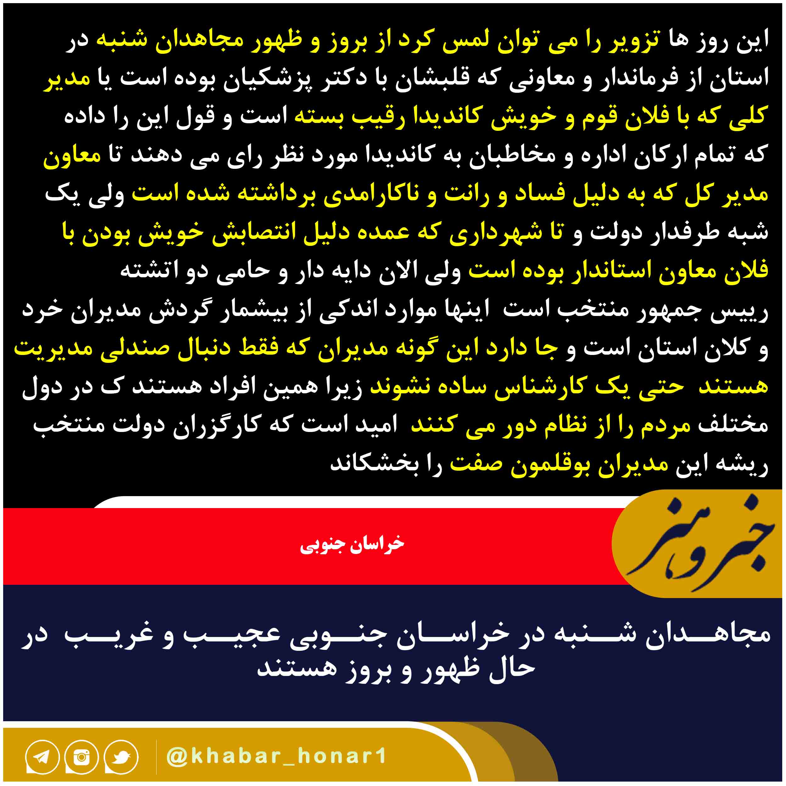 این روز ها تزویر را می توان لمس کرد از بروز و ظهور مجاهدان شنبه در استان از فرماندار و معاونی که قلبشان با دکتر پزشکیان بوده است یا مدیر کلی که با فلان قوم و خویش کاندیدا رقیب بسته است و قول این را داده که تمام ارکان اداره و مخاطبان به کاندیدا مورد نظر رای می دهند تا معاون مدیر کل که به دلیل فساد و رانت و ناکارامدی برداشته شده است ولی یک شبه طرفدار دولت و تا شهرداری که عمده دلیل انتصابش خویش بودن با فلان معاون استاندار بوده است ولی الان دایه دار و حامی دو اتشته رییس جمهور منتخب است اینها موارد اندکی از بیشمار گردش مدیران خرد و کلان استان است و جا دارد این گونه مدیران که فقط دنبال صندلی مدیریت هستند حتی یک کارشناس ساده نشوند زیرا همین افراد هستند ک در دول مختلف مردم را از نظام دور می کنند امید است که کارگزران دولت منتخب ریشه این مدیران بوقلمون صفت را بخشکاند