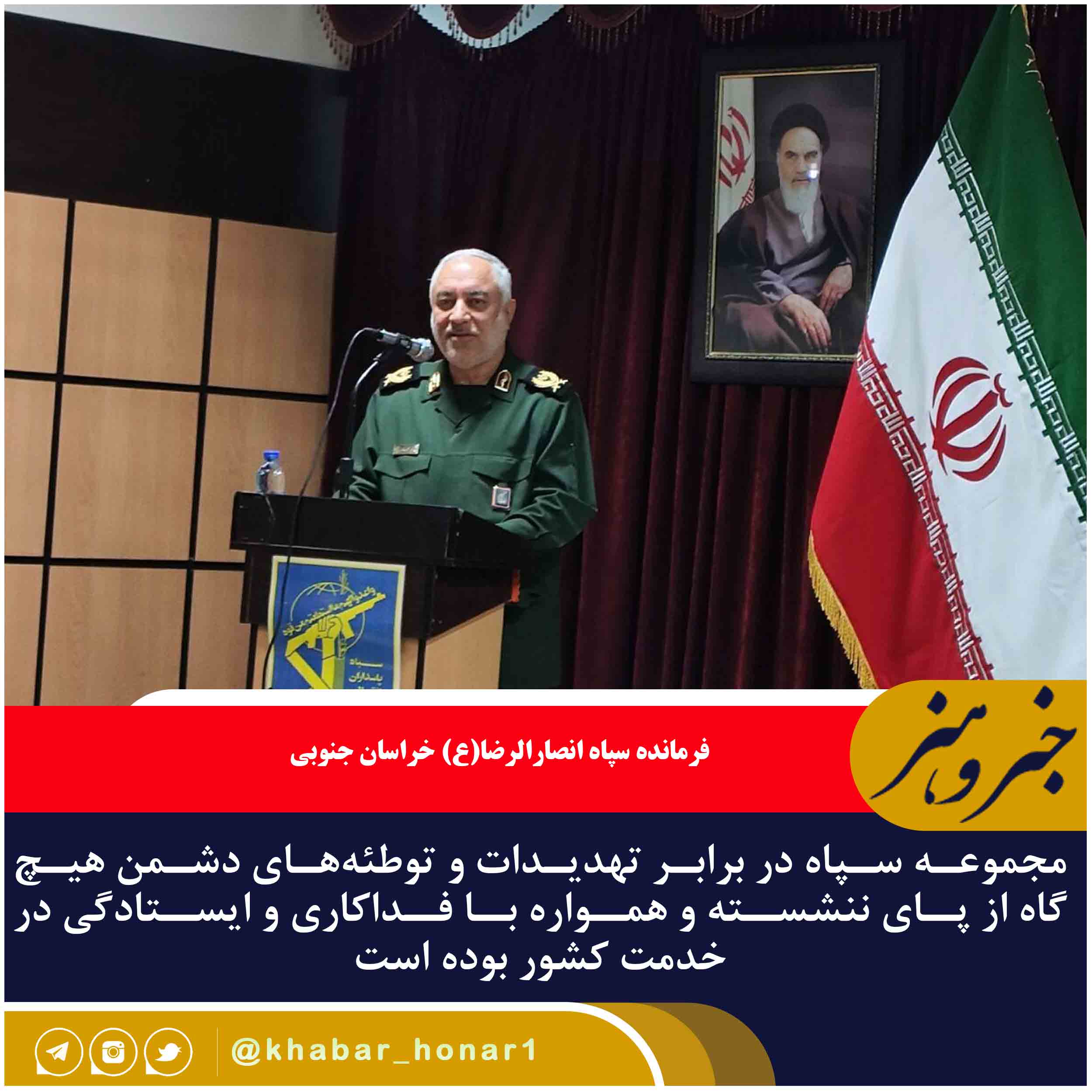 فرمانده سپاه انصارالرضا(ع) خراسان جنوبی تأکید کرد: مجموعه سپاه در برابر تهدیدات و توطئه‌های دشمن هیچ‌گاه از پای ننشسته و همواره با فداکاری و ایستادگی در خدمت کشور بوده است.