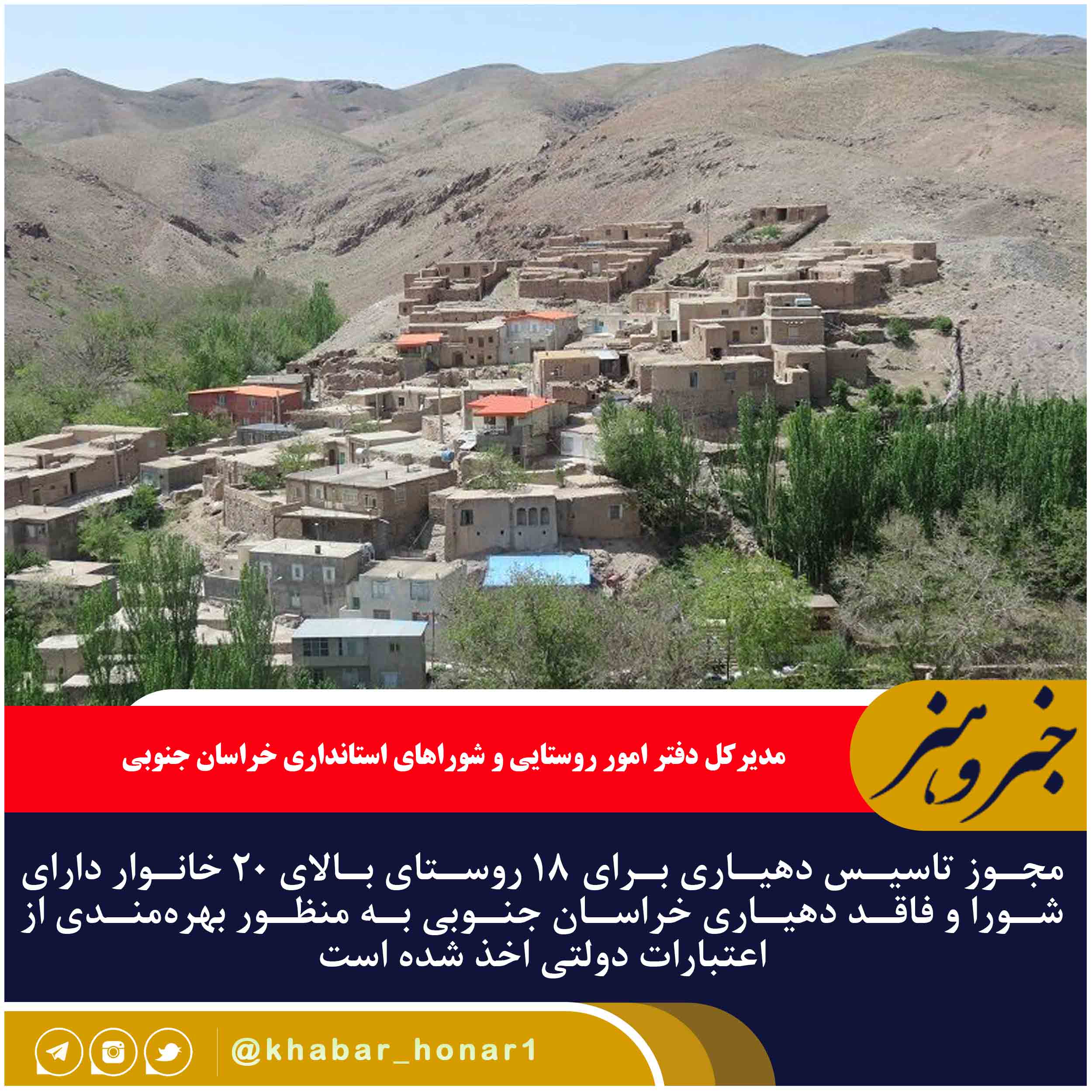 مدیرکل دفتر امور روستایی و شوراهای استانداری خراسان جنوبی گفت: مجوز تاسیس دهیاری برای ۱۸ روستای بالای ۲۰ خانوار دارای شورا و فاقد دهیاری خراسان جنوبی به منظور بهرهمندی از اعتبارات دولتی اخذ شده است.