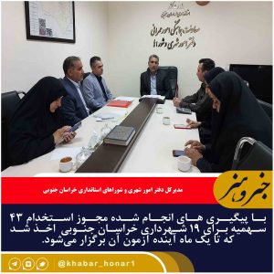 مدیرکل دفتر امور شهری و شوراهای استانداری خراسان جنوبی گفت: با پیگیری های انجام شده مجوز استخدام ۴۳ سهمیه برای ۱۹ شهرداری خراسان جنوبی  اخذ شد که تا یک ماه آینده آزمون آن برگزار می‌شود.