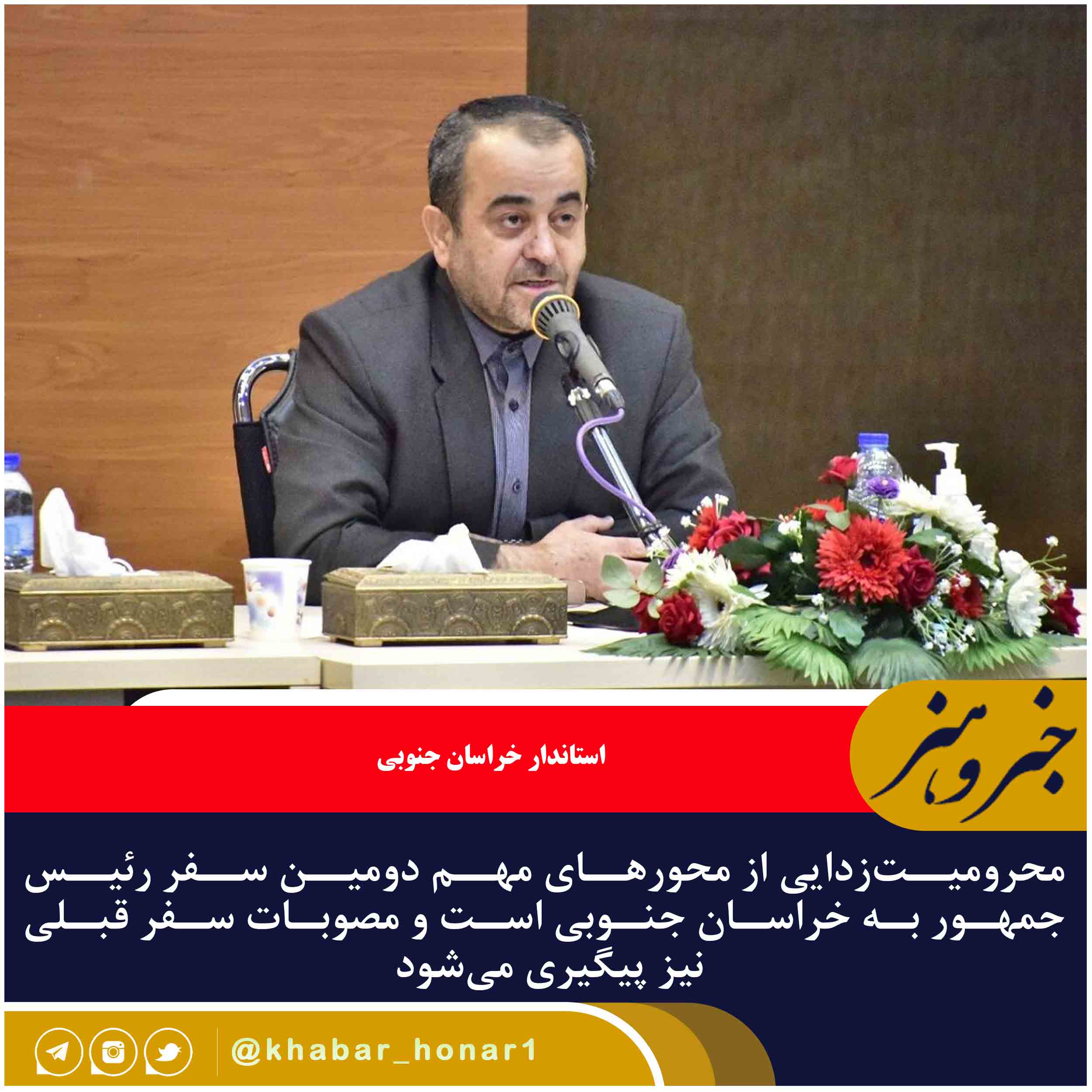 – استاندار خراسان جنوبی گفت: محرومیتزدایی از محورهای مهم دومین سفر رئیس جمهور به خراسان جنوبی است و مصوبات سفر قبلی نیز پیگیری میشود.