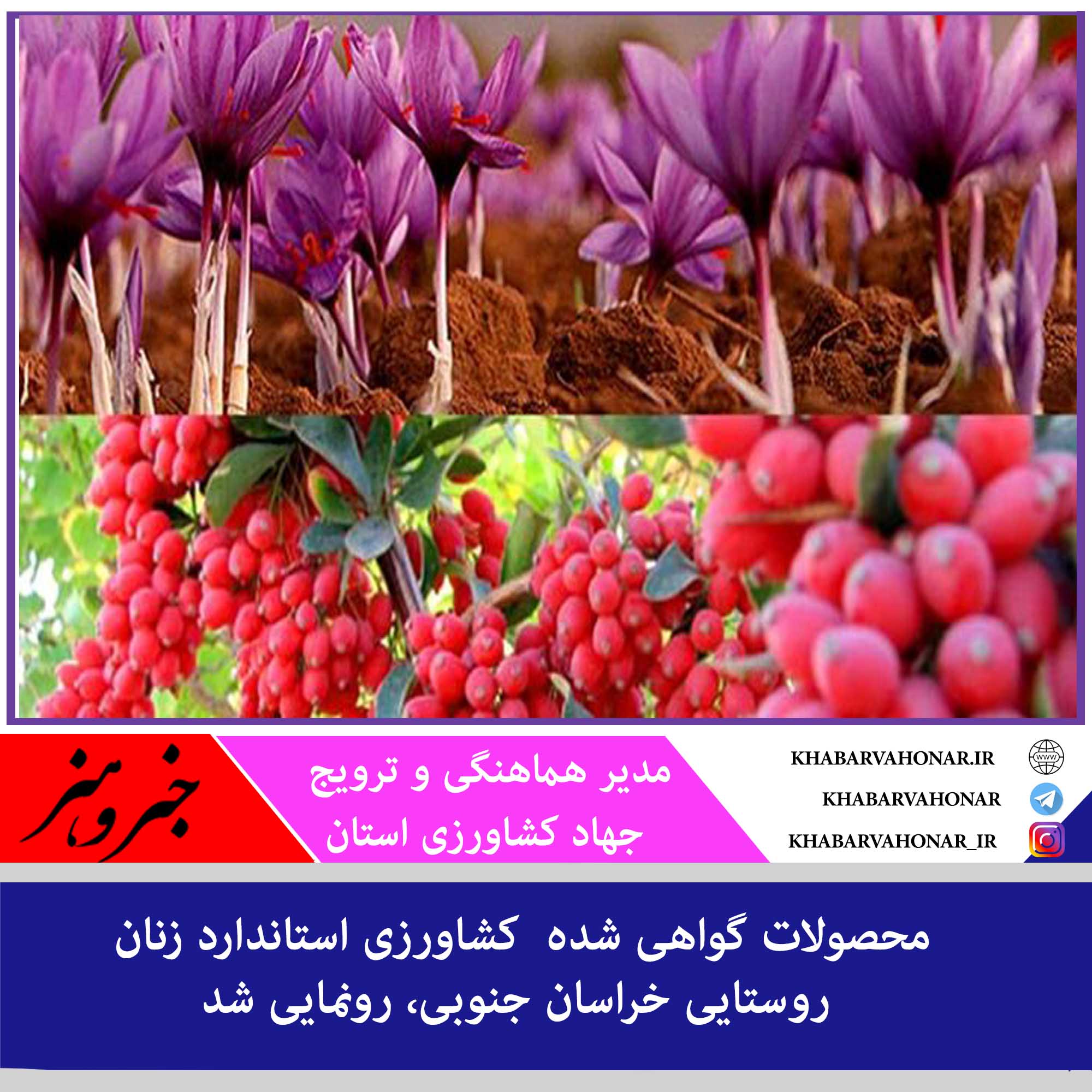 - شیبانی افزود: امروز نیز پس از گذشت ۲ سال از آغاز طرح، از چهار محصول زرشک شهرستان بیرجند، سبزیجات برگی طبس، خیارسبز گلخانهای خوسف و زعفران از شهرستان فردوس رونمایی شد.