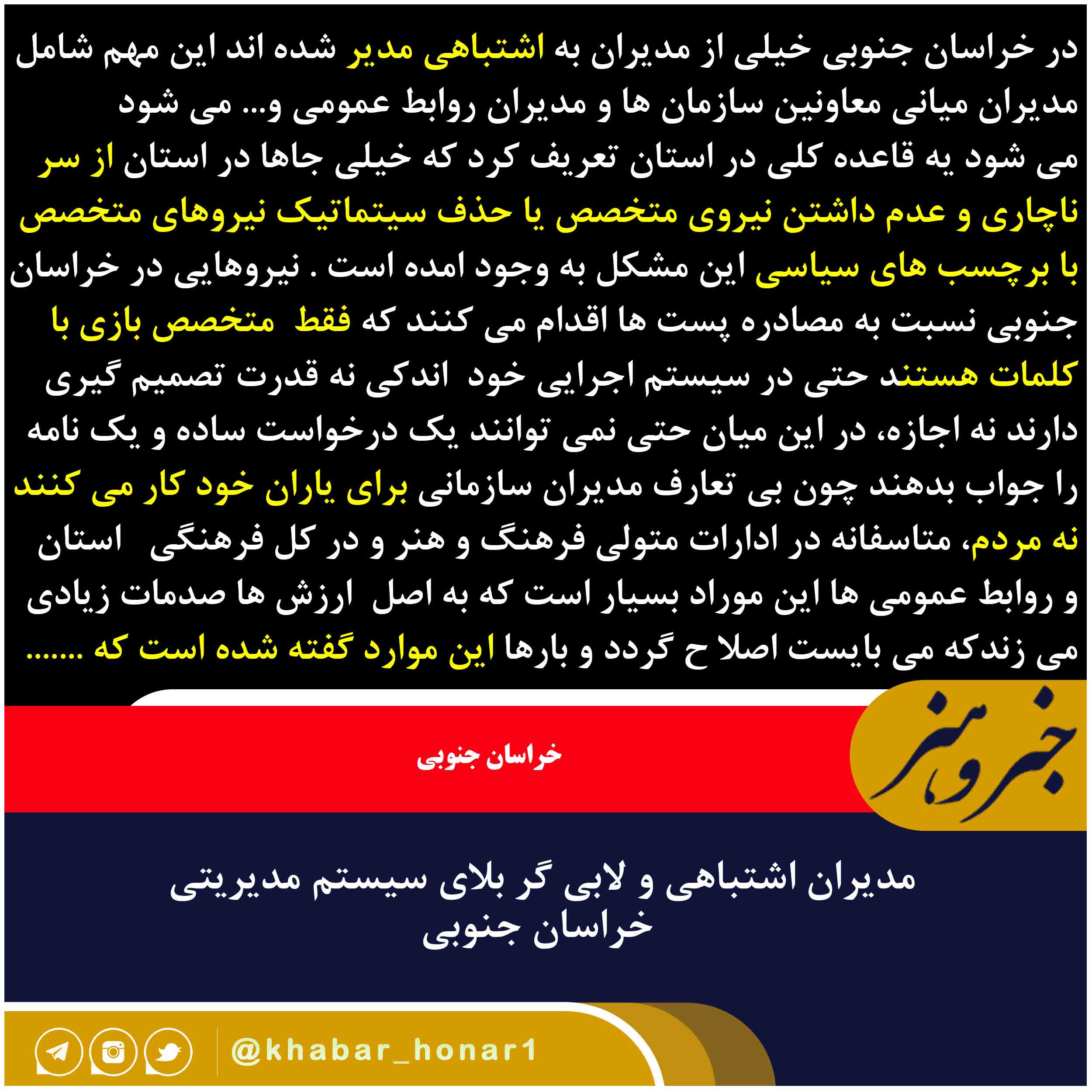 در خراسان جنوبی خیلی از مدیران به اشتباهی مدیر شده اند این مهم شامل مدیران میانی معاونین سازمان ها و مدیران روابط در خراسان جنوبی خیلی از مدیران به اشتباهی مدیر شده اند این مهم شامل مدیران میانی معاونین سازمان ها و مدیران روابط عمومی و… می شود می شود یه قاعده کلی در استان تعریف کرد که خیلی جاها در استان از سر ناچاری و عدم داشتن نیروی متخصص یا حذف سیتماتیک نیروهای متخصص با برچسب های سیاسی این مشکل به وجود امده است . نیروهایی در خراسان جنوبی نسبت به مصادره پست ها اقدام می کنند که فقط متخصص بازی با کلمات هستند حتی در سیستم اجرایی خود اندکی نه قدرت تصمیم گیری دارند نه اجازه، در این میان حتی نمی توانند یک درخواست ساده و یک نامه را جواب بدهند چون بی تعارف مدیران سازمانی برای یاران خود کار می کنند نه مردم، متاسفانه در ادارات متولی فرهنگ و هنر و در کل فرهنگی استان و روابط عمومی ها این موراد بسیار است که به اصل ارزش ها صدمات زیادی می زندکه می بایست اصلا ح گردد و بارها این موارد گفته شده است که …….