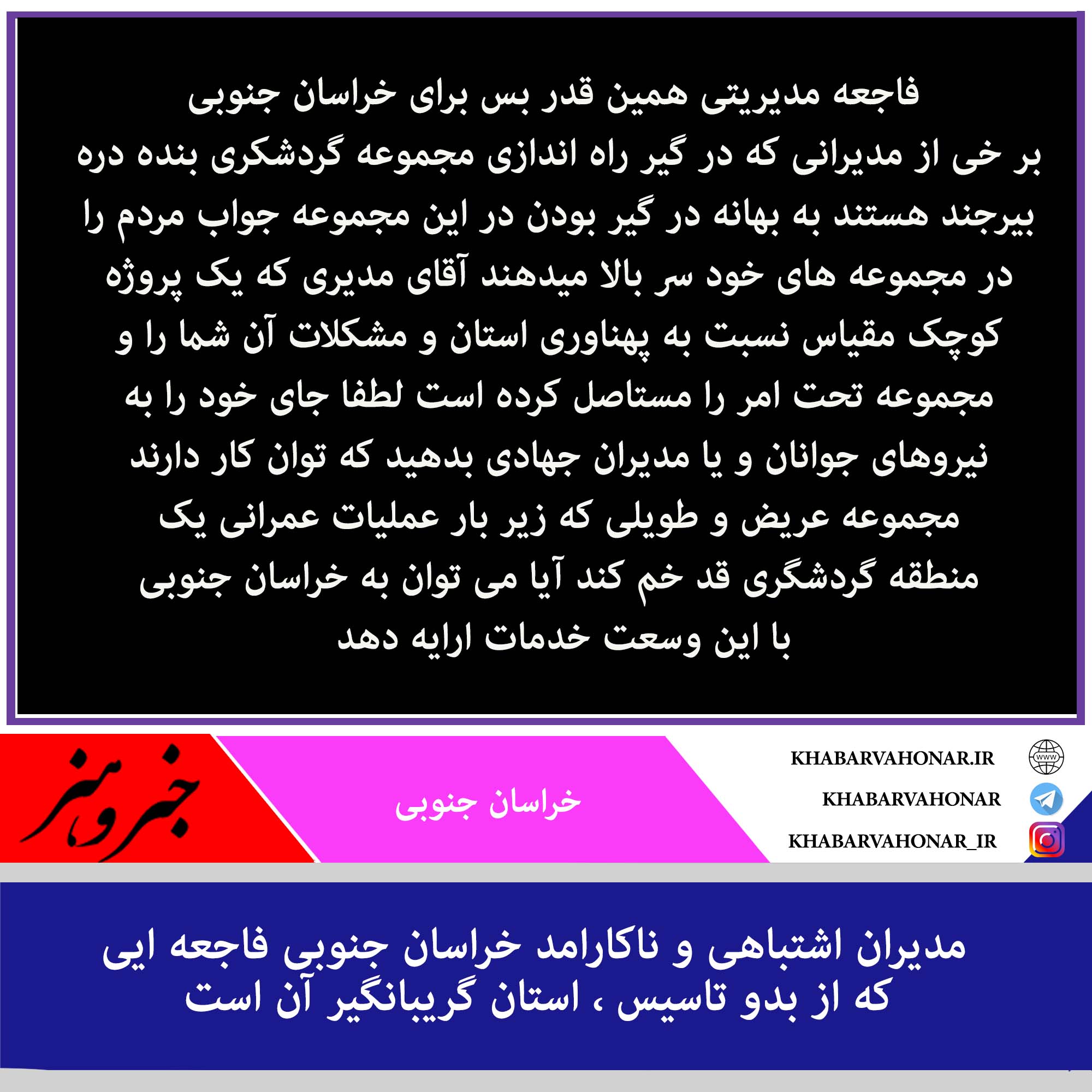 فاجعه مدیریتی همین قدر بس برای خراسان جنوبی برخی از مدیرانی که در گیر راه اندازی مجموعه گردشکری بنده دره بیرجند هستند به بهانه در گیر بودن در این مجموعه جواب مردم را در مجموعه های خود سر بالا میدهند آقای مدیری که یک پروژه کوچک مقیاس نسبت به پهناوری استان و مشکلات آن شما را و مجموعه تحت امر را مستاصل کرده است لطفا جای خود را به نیروهای جوانان و یا مدیران جهادی بدهید که توان کار دارند مجموعه عریض و طویلی که زیر بار عملیات عمرانی یک منطقه گردشگری قد خم کند آیا می توان به خراسان جنوبی با این وسعت خدمات ارایه دهد