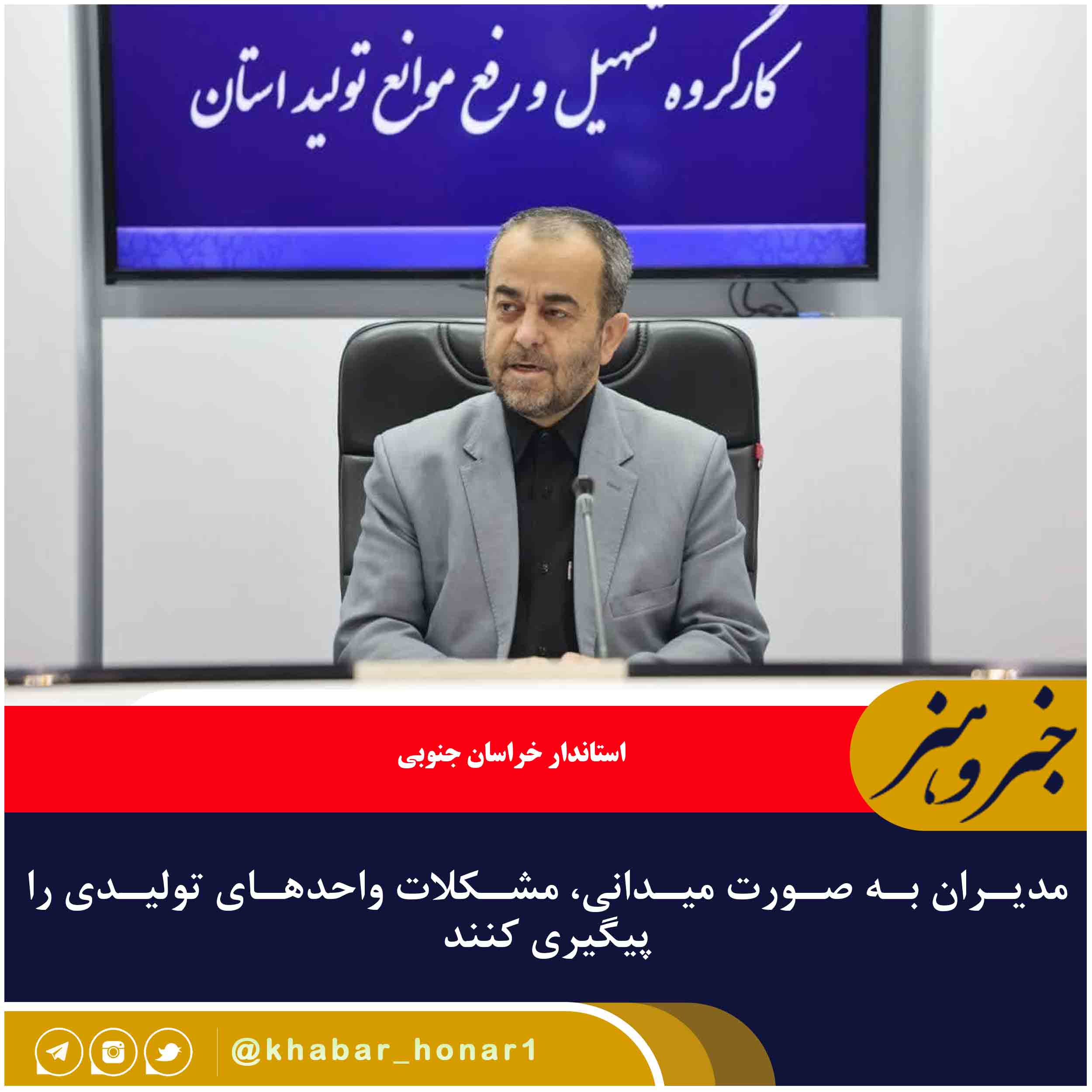 ?استاندار خراسان جنوبی تأکید کرد: مدیران دستگاه های اجرایی به صورت میدانی، مشکلات واحدهای تولیدی را احصا و پیگیری کنند.
