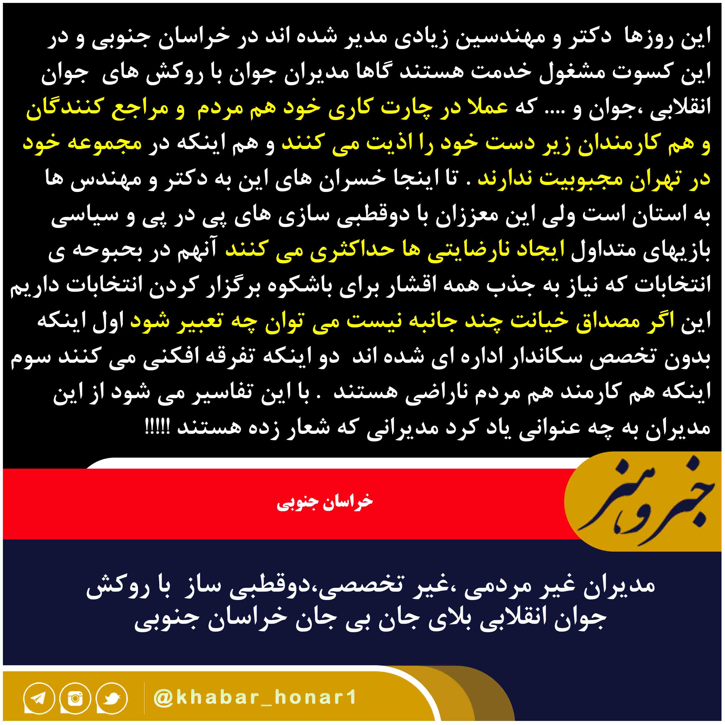 این روزها دکتر و مهندسین زیادی مدیر شده اند در خراسان جنوبی و در این کسوت مشغول خدمت هستند گاها مدیران جوان با روکش های جوان انقلابی ،جوان و …. که عملا در چارت کاری خود هم مردم و مراجع کنندگان و هم کارمندان زیر دست خود را اذیت می کنند و هم اینکه در مجموعه خود در تهران مجبوبیت ندارند . تا اینجا خسران های این به دکتر و مهندس ها به استان است ولی این معززان با دوقطبی سازی های پی در پی و سیاسی بازیهای متداول ایجاد نارضایتی ها حداکثری می کنند آنهم در بحبوحه ی انتخابات که نیاز به جذب همه اقشار برای باشکوه برگزار کردن انتخابات داریم این اگر مصداق خیانت چند جانبه نیست می توان چه تعبیر شود اول اینکه بدون تخصص سکاندار اداره ای شده اند دو اینکه تفرقه افکنی می کنند سوم اینکه هم کارمند هم مردم ناراضی هستند . با این تفاسیر می شود از این مدیران به چه عنوانی یاد کرد مدیرانی که شعار زده هستند !!!!!