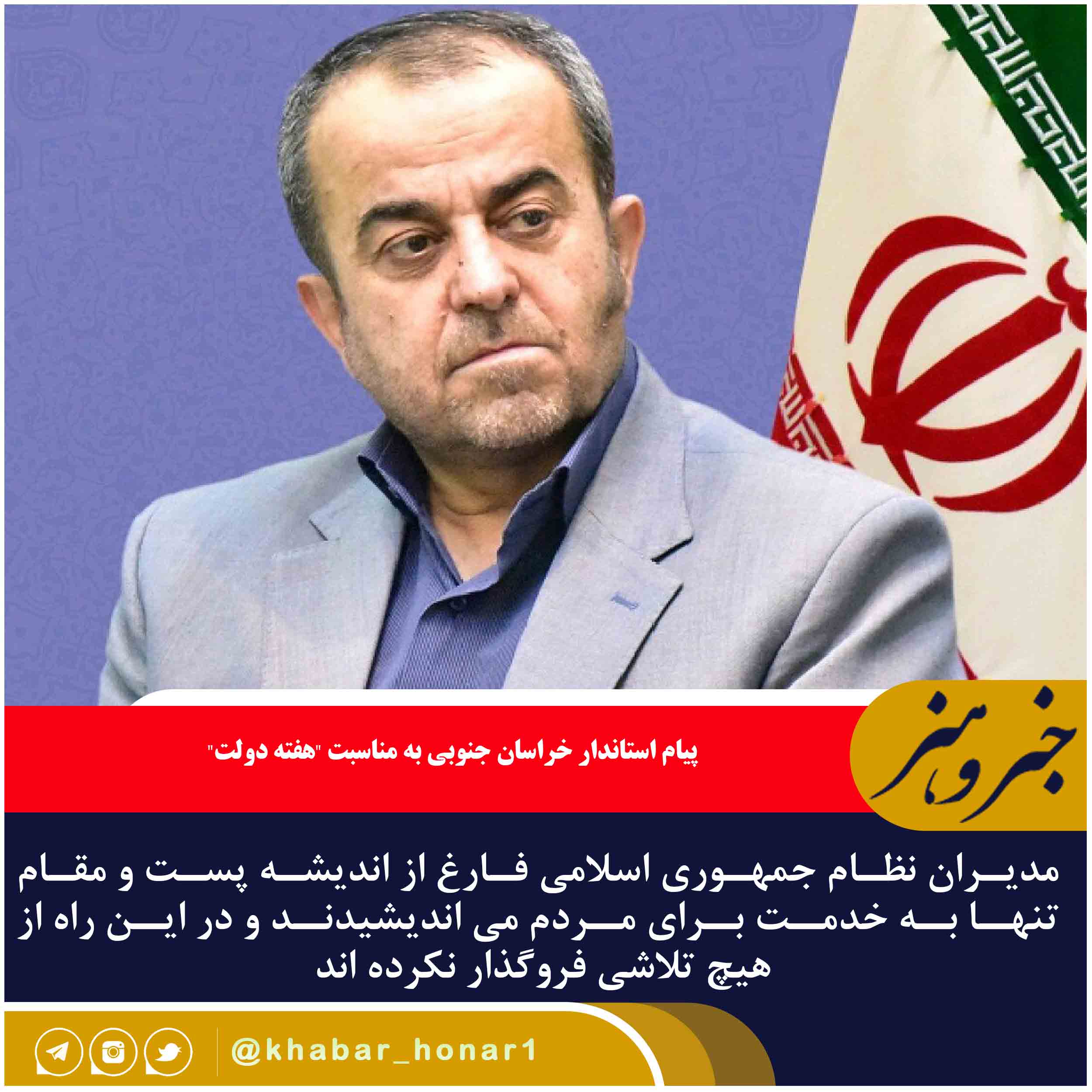 ?اینجانب ضمن گرامیداشت یاد و خاطره شهدای والامقام دولت به ویژه شهیدان رجایی و باهنر، هفته دولت و روز کارمند را به همه کارگزاران خدوم و کارمندان متعهد به ویژه در استان خراسان جنوبی تبریک و تهنیت عرض نموده، سرافرازی همگان را در تحقق آرمان های بلند حضرت امام خمینی( قدس سره )، منویات مقام معظم رهبری (حفظه الله تعالی) و سیاست های دولت مردمی ایران قوی ذیل ولایت قطب عالم امکان حضرت بقیهالله الاعظم ارواحنا فداه از درگاه حقیقهالحقایق مسئلت دارم.