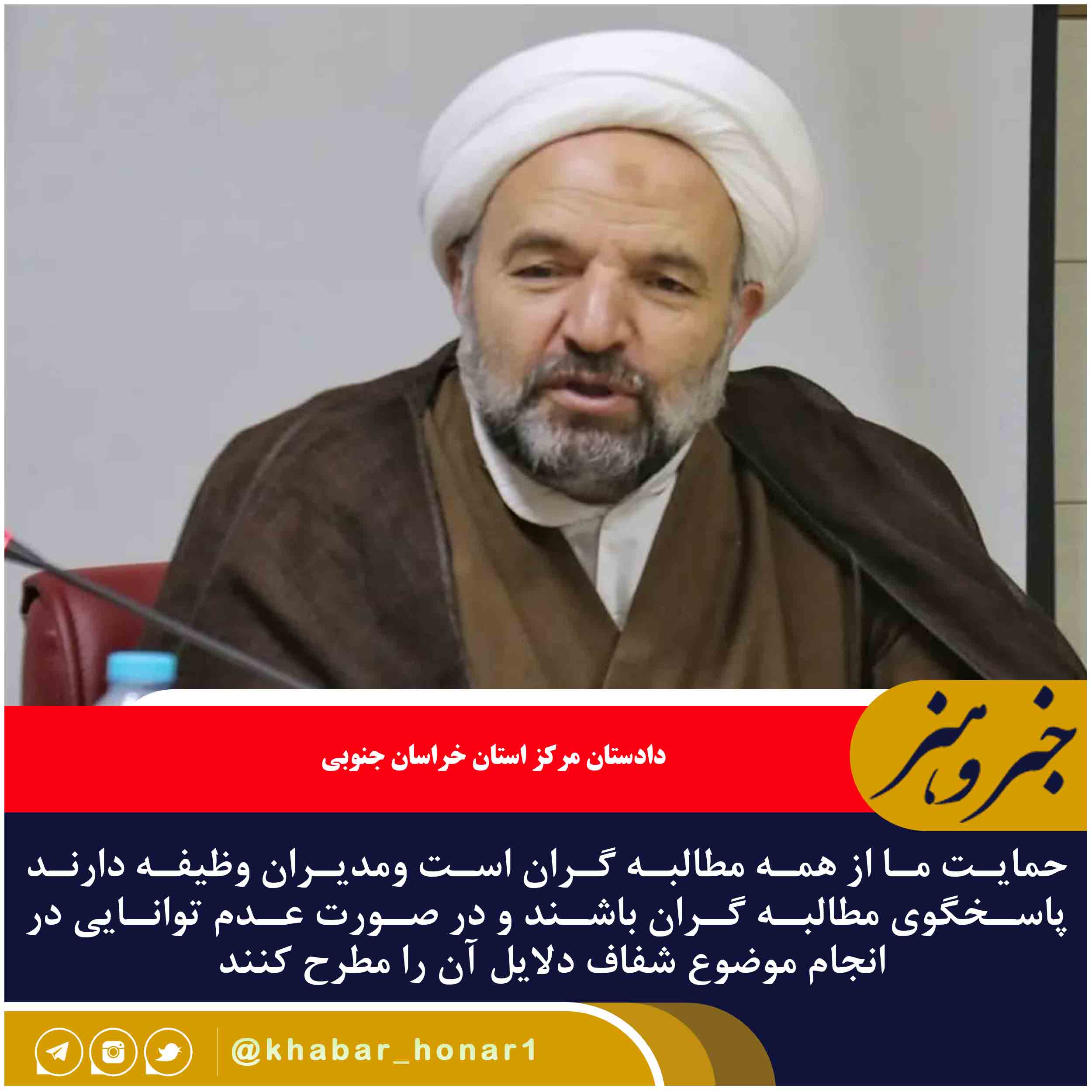 دادستان مرکز استان خراسان جنوبی  در دیدار با دبیران مجمع مطالبه گران بیان کرد: حمایت ما از همه مطالبه گران است ومدیران وظیفه دارند پاسخگوی مطالبه گران باشند و در صورت عدم توانایی در انجام موضوع شفاف دلایل آن را مطرح کنند از هر مدیری که واقعابرای این استان کار بکند حمایت می کنیم.