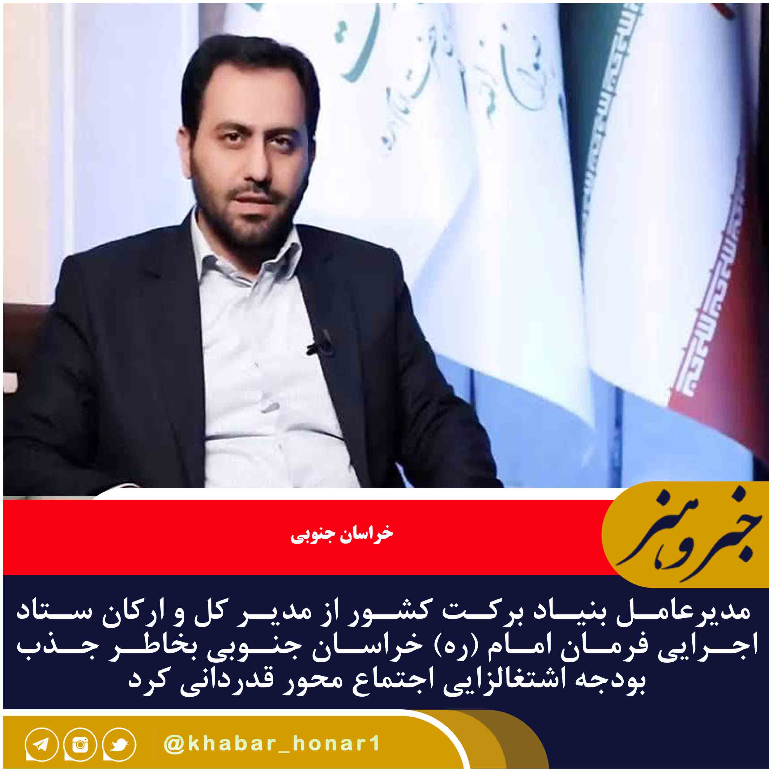 (تقدیر و تشکر مدیر عامل بنیاد برکت کشور از تلاشهای جهادی موسوی ،مدیر کل ستاد اجرایی فرمان حضرت امام (ره) خراسان جنوبی جهت گام مؤثر در تحقق منویات بنیانگذار جمهوری اسلامی ایران (ره) و مقام معظم رهبری در عرصه محرومیت زدایی و توانمندسازی اقتصادی و اجتماعی مناطق کم برخورار و محروم استان خراسان جنوبی)