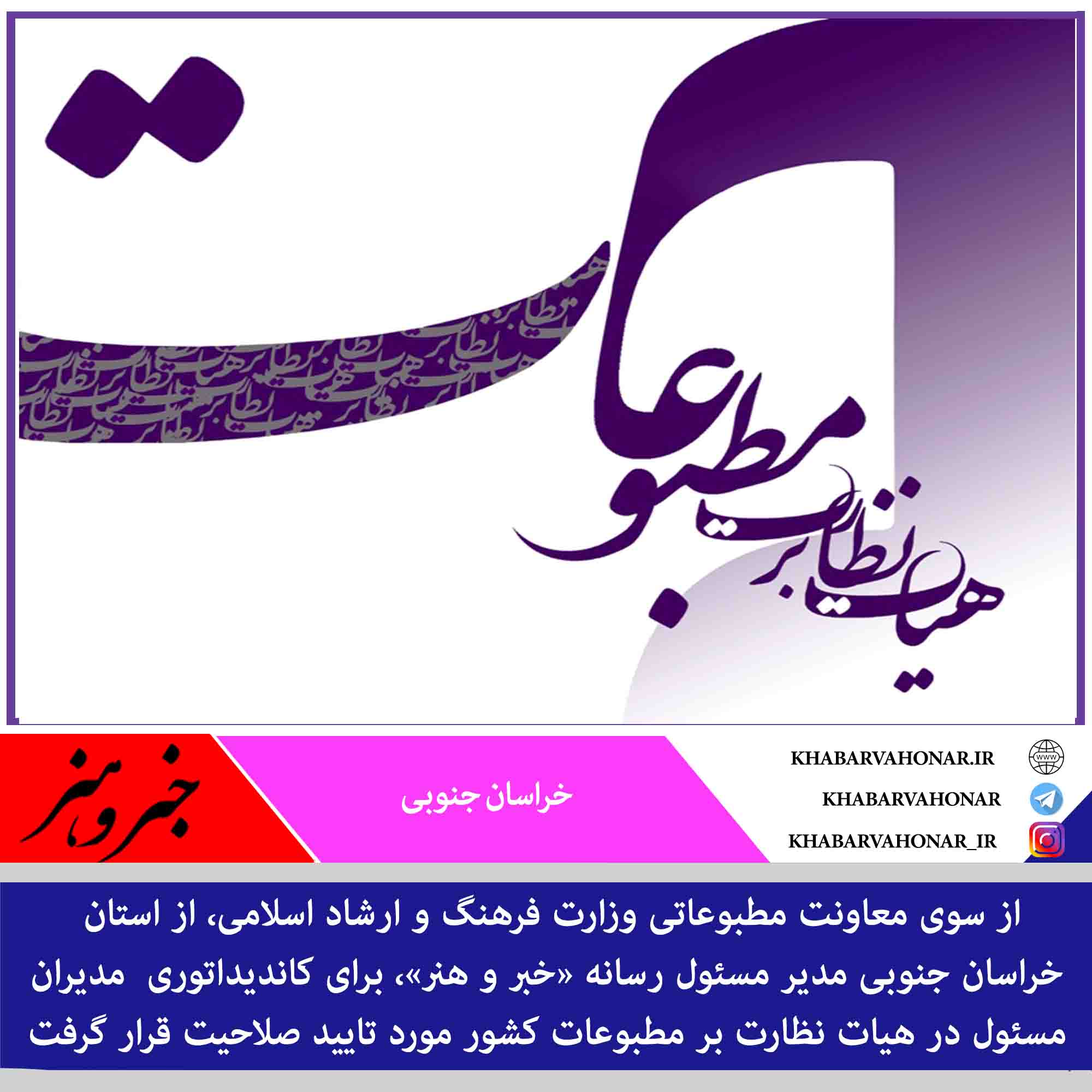 از سوی معاونت مطبوعاتی وزارت فرهنگ و ارشاد اسلامی، از استان خراسان جنوبی، ابوالفضل حسنپور، مدیر مسئول رسانه «خبر و هنر»، برای کاندیداتوری مدیران مسئول در هیات نظارت بر مطبوعات کشور مورد تایید صلاحیت قرار گرفت.