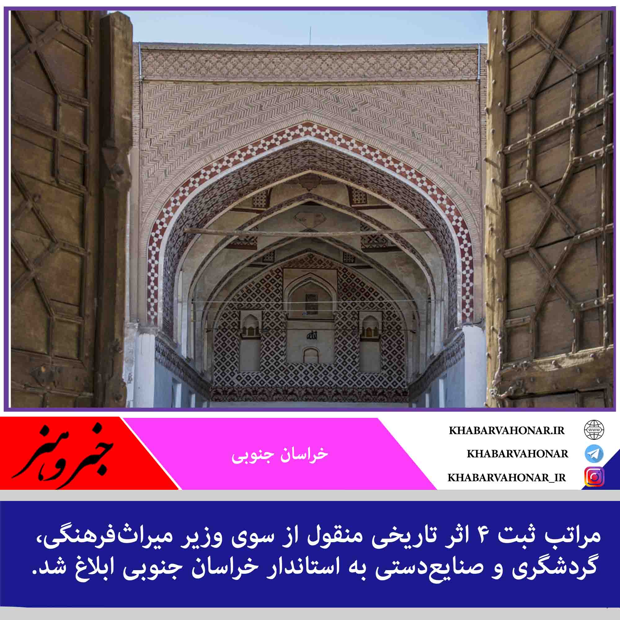 ، علی شریعتی منش معاون میراث فرهنگی استان گفت: «ثبت آثار تاریخی آجرهای منقوش قلعه کل حسن صباح درمیان، آجر منقوش محوطه کهنک سربیشه، پیکرک سنگی محوطه گوند شهرستان فردوس، درب چوبی مسجد جامع قاین توسط وزیر میراث فرهنگی،گردشگری وصنایع دستی کشور به استاندار خراسان جنوبی به منظور ابلاغ به مسوولین مربوطه اعلام شد.»