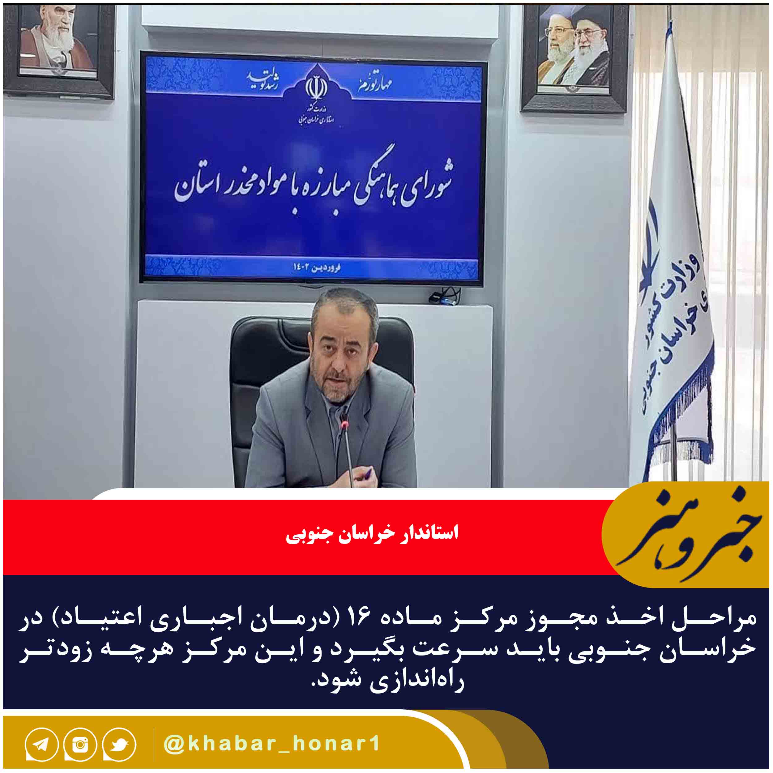 استاندار خراسان جنوبی گفت: مراحل اخذ مجوز مرکز ماده ۱۶ (درمان اجباری اعتیاد) در خراسان جنوبی باید سرعت بگیرد و این مرکز هرچه زودتر راهاندازی شود.