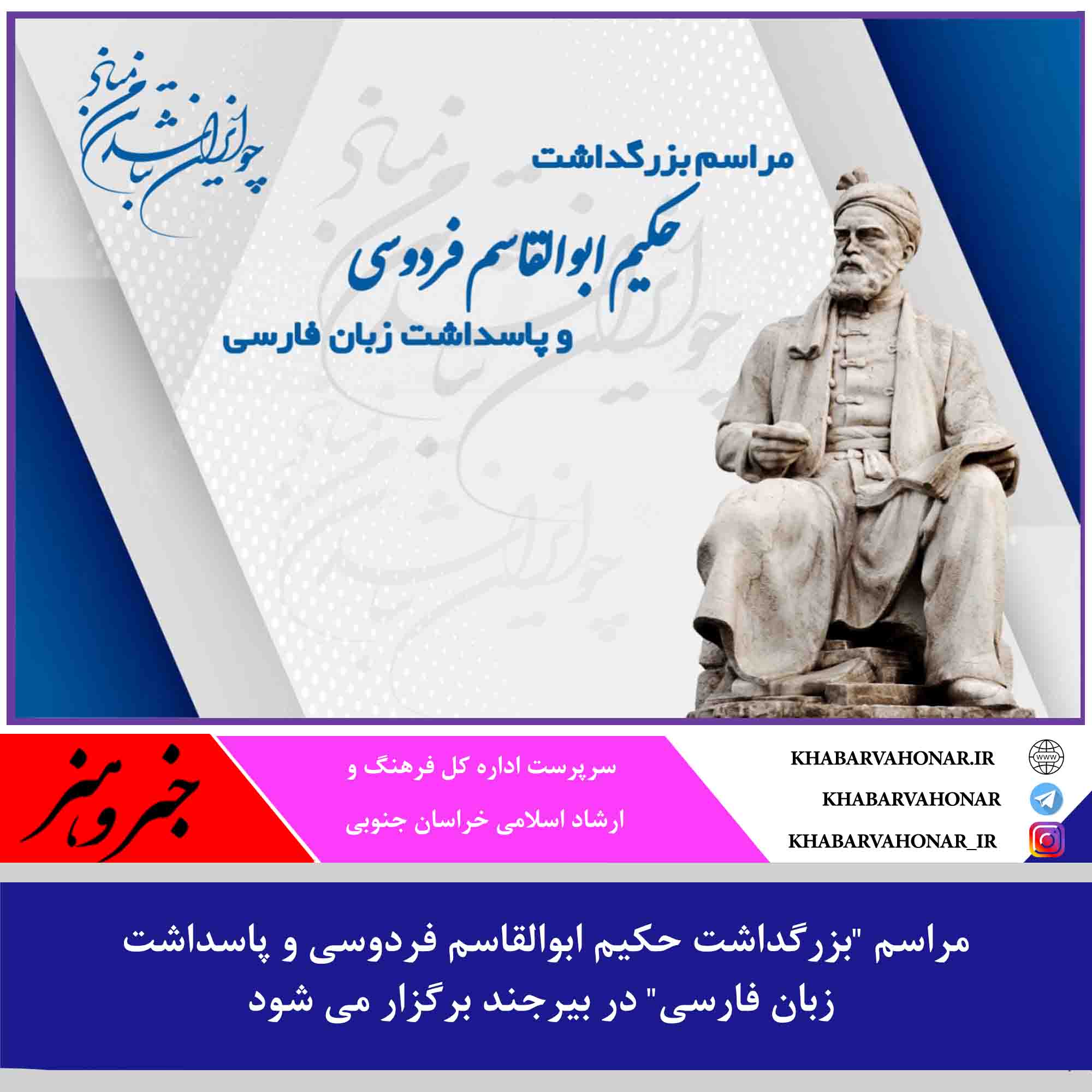 سرپرست اداره کل فرهنگ و ارشاد اسلامی خراسان جنوبی گفت: به مناسبت روز بزرگداشت فردوسی و پاسداشت زبان فارسی، مراسمی با حضور علاقه مندان به فرهنگ و هنر برگزار می شود.