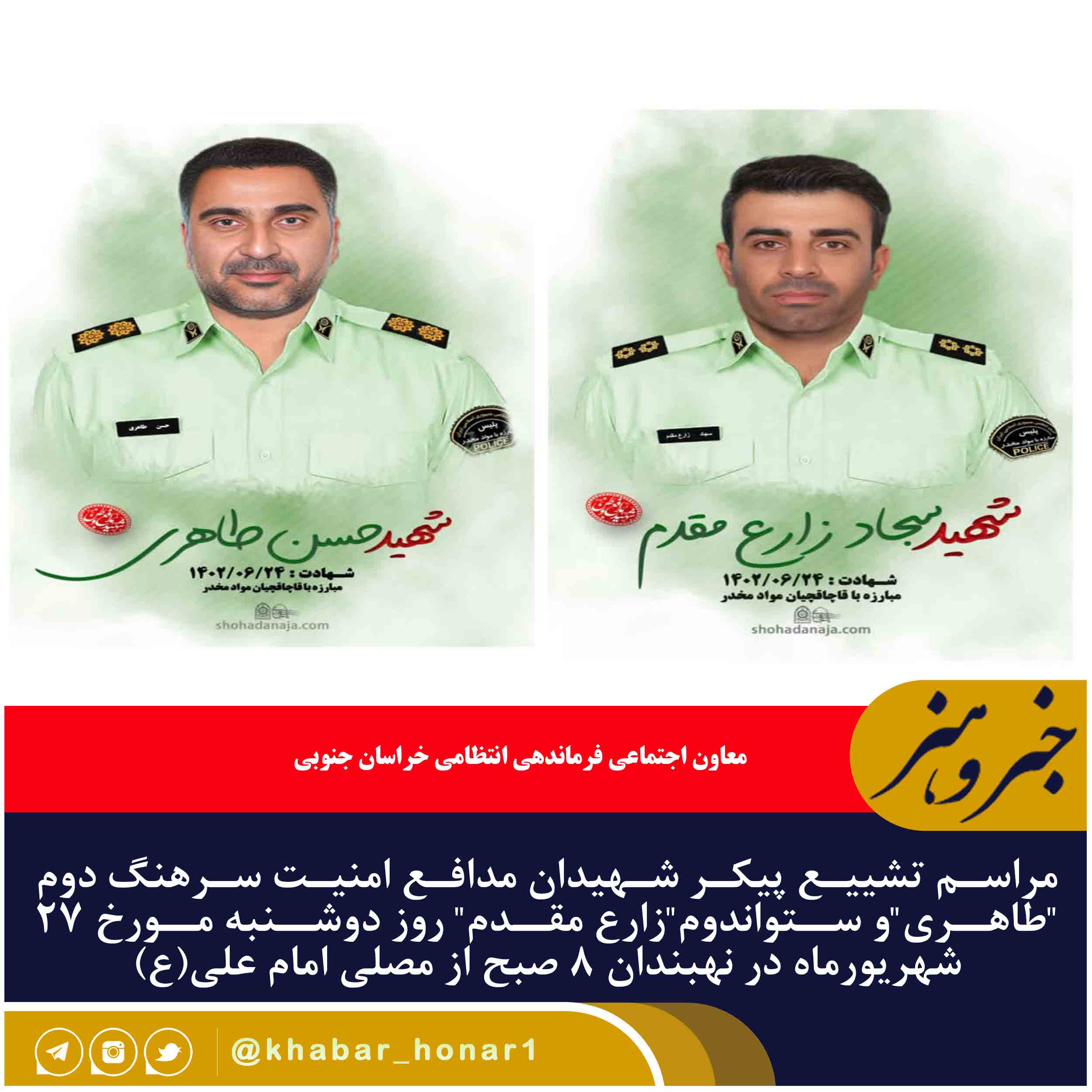 ،سرهنگ”علی اکبر حیدری” در تشریح این خبر اظهار داشت: مراسم تشییع پیکر پاک و مطهر شهیدان مدافع امنیت سرهنگ دوم “حسن طاهری” و ستواندوم”سجاد زارع مقدم” روز دوشنبه مورخ ۲۷ شهریورماه ساعت ۸ صبح از محل مصلی امام علی(ع) به سمت چهارراه معلم شهرستان نهبندان برگزار خواهد شد.