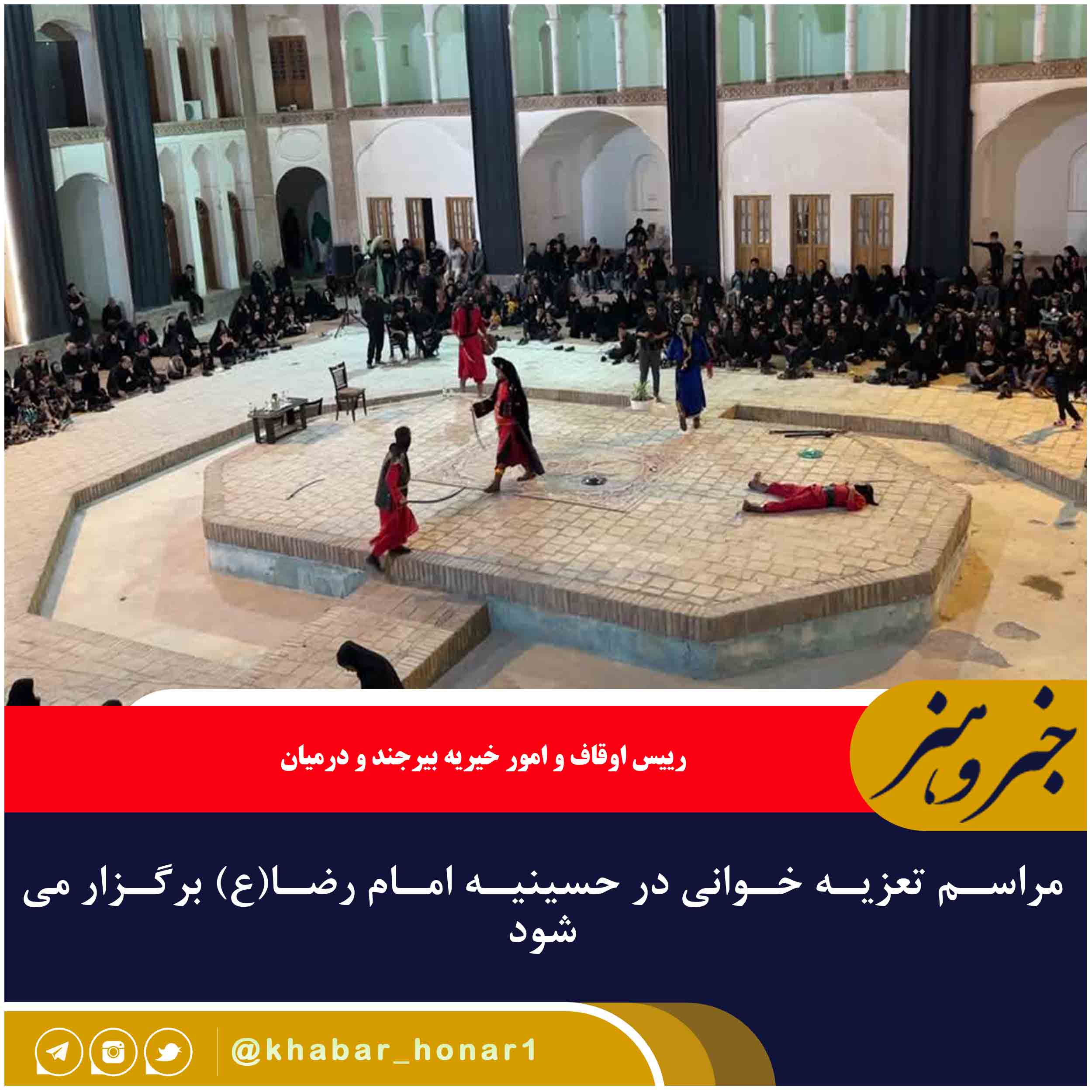 رییس اوقاف و امور خیریه بیرجند و درمیان گفت: به مناسبت ایام عزاداری مراسم تعزیه خوانی در حسینیه امام رضا(ع) برگزار می شود.