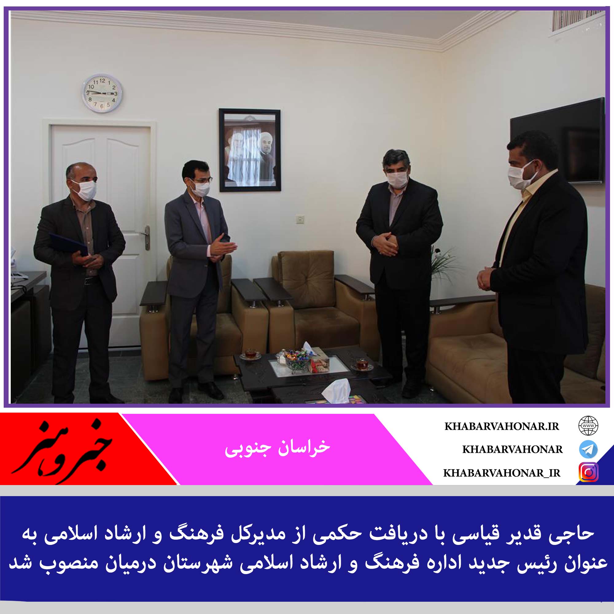 در ادامه با اهدای لوح سپاس از زحمات آقای حسن حسینی دشت بیاض قدردانی و حاجی قدیر قیاسی با دریافت حکمی از مدیرکل فرهنگ و ارشاد اسلامی به عنوان رئیس جدید اداره فرهنگ و ارشاد اسلامی شهرستان درمیان منصوب شد.