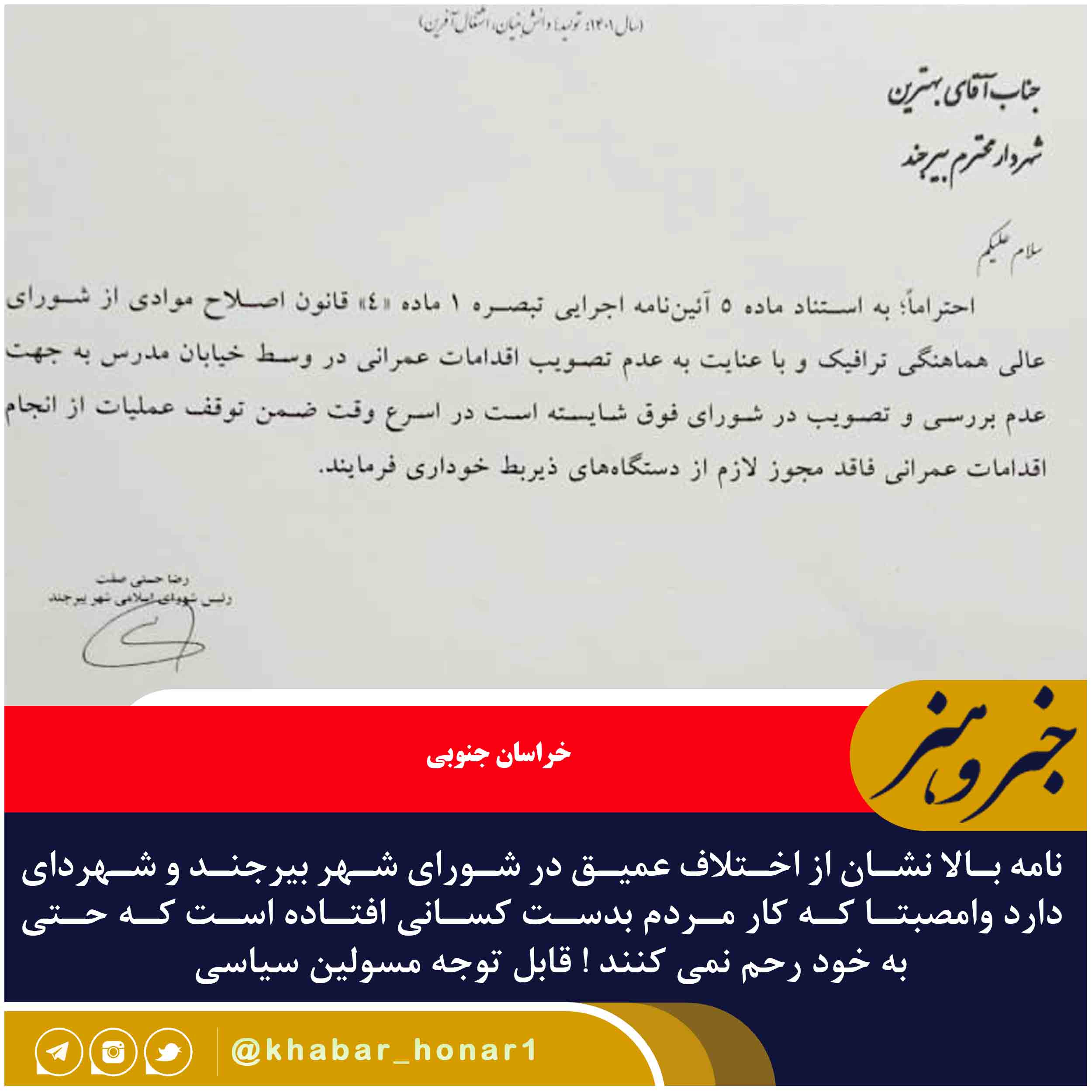 نامه بالا نشان از اختلاف عمیق در شورای شهر بیرجند و شهردای دارد وامصبتا که کار مردم بدست کسانی افتاده است که حتی به خود رحم نمی کنند ! قابل توجه مسولین سیاسی