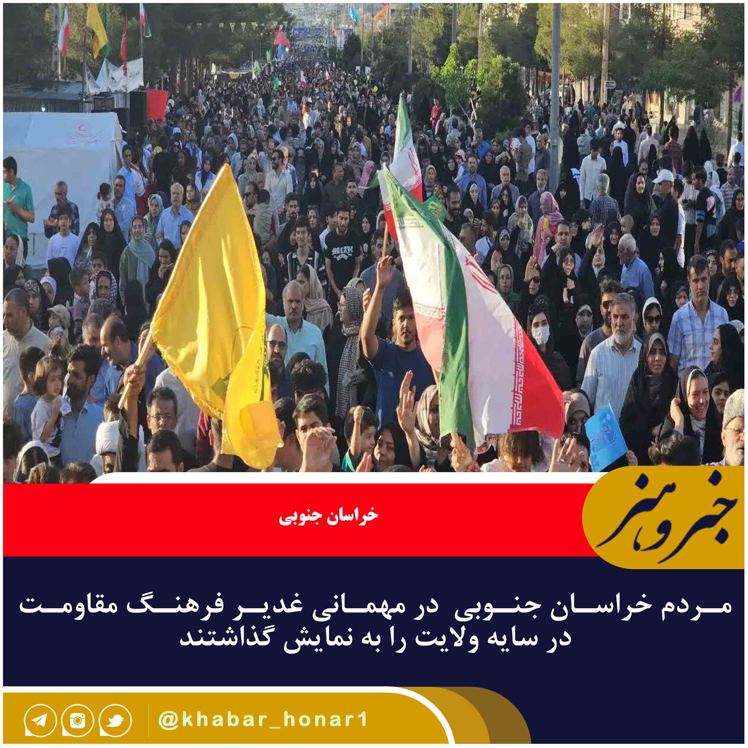 مهمانی کیلومتری غدیر در جای جای خراسان جنوبی با جلوههایی از شکوه وحدت، همبستگی و مقاومت برگزارشد؛ اما نه صرفا به عنوان یک آیین، بلکه صحنه ای از اتحاد ملی با فریاد انتقام خیبری بود که تجلی فرهنگ مقاومت در سایه ولایت را به نمایش گذاشت.