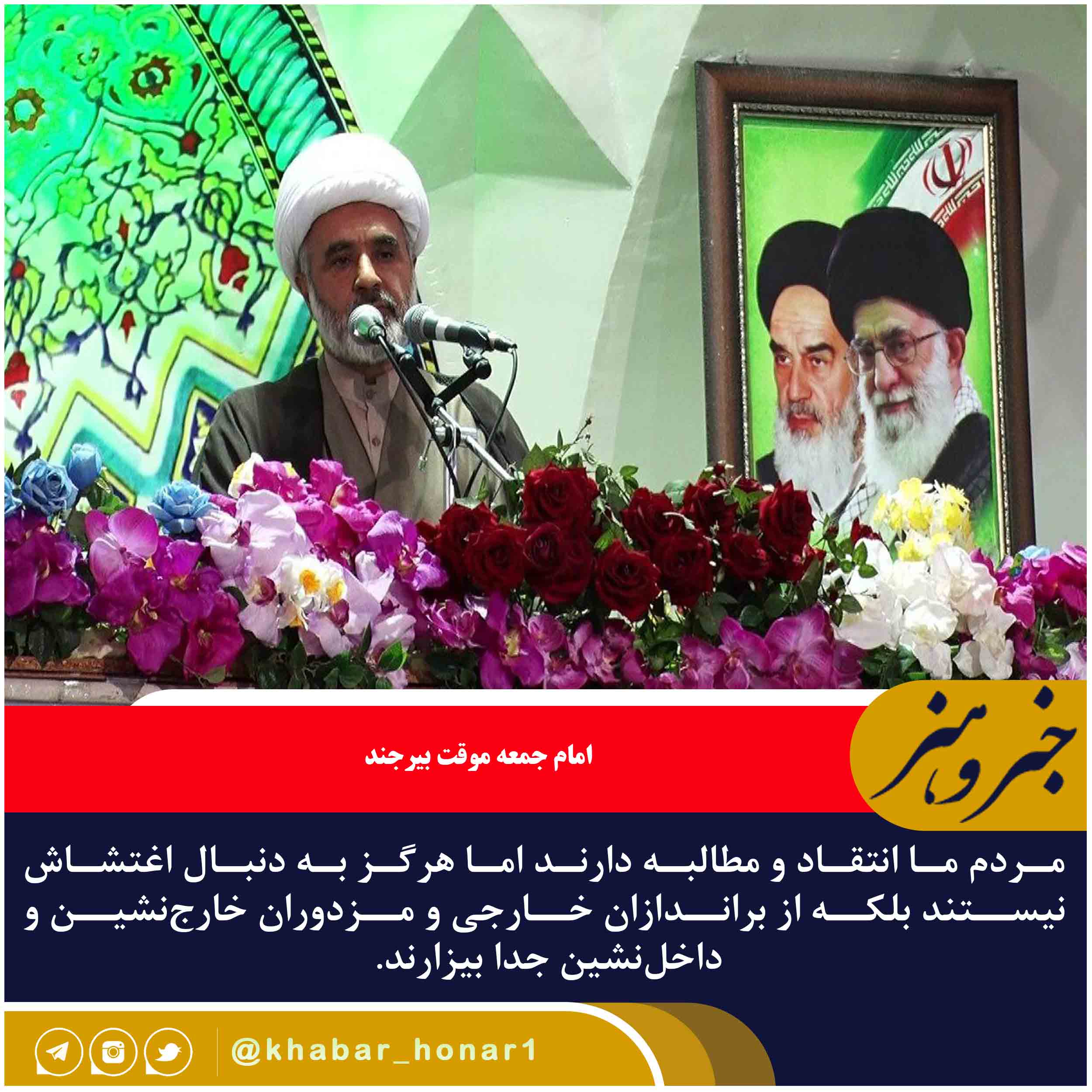 امام جمعه موقت بیرجند گفت: مردم ما انتقاد و مطالبه دارند اما هرگز به دنبال اغتشاش نیستند بلکه از براندازان خارجی و مزدوران خارجنشین و داخلنشین جدا بیزارند.