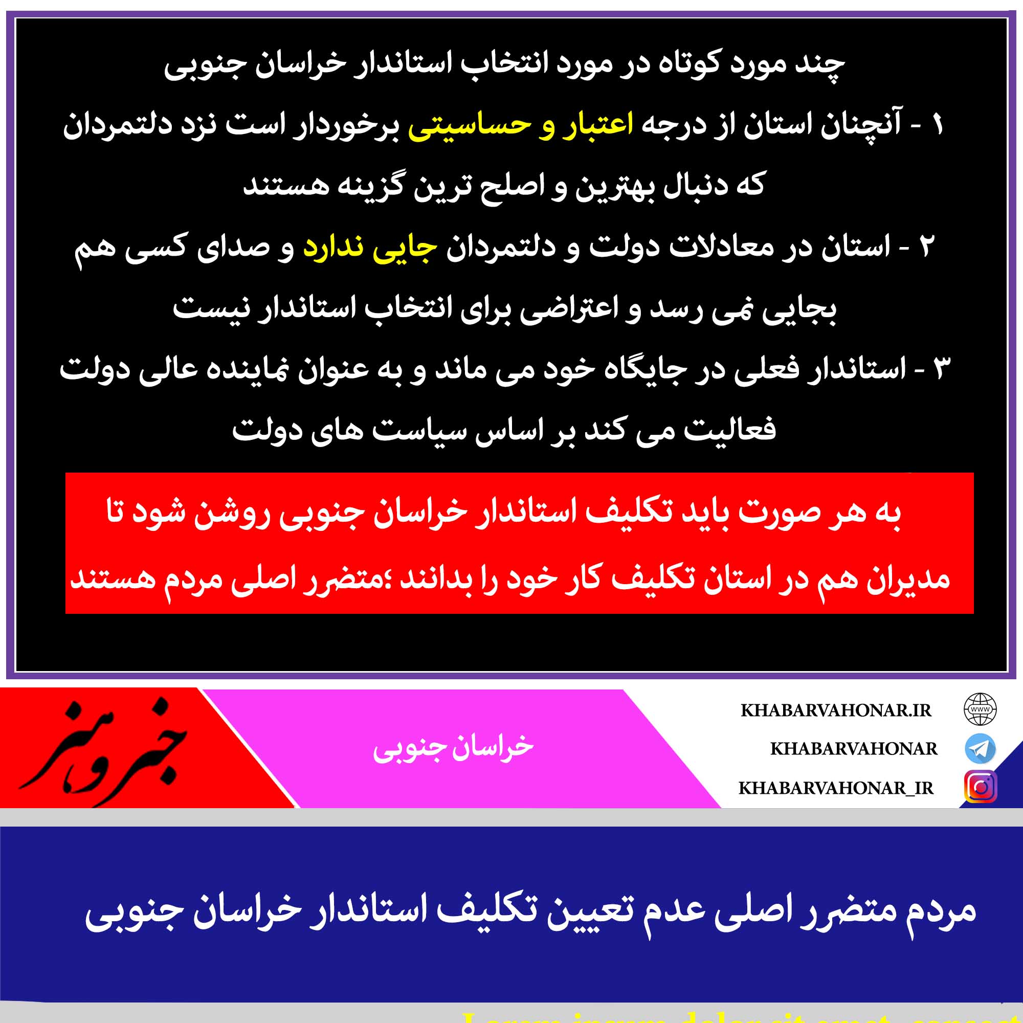 چند مورد کوتاه در مورد انتخاب استاندار خراسان جنوبی ۱ – آنچنان استان از درجه اعتبار و حساسیتی برخوردار است نزد دلتمردان که دنبال بهترین و اصلح ترین گزینه هستند ۲ – استان در معادلات دولت و دلتمردان جایی ندارد و صدای کسی هم بجایی نمی رسد و اعتراضی برای انتخاب استاندار نیست ۳ – استاندار فعلی در جایگاه خود می ماند و به عنوان نماینده عالی دولت فعالیت می کند بر اساس سیاست های دولت