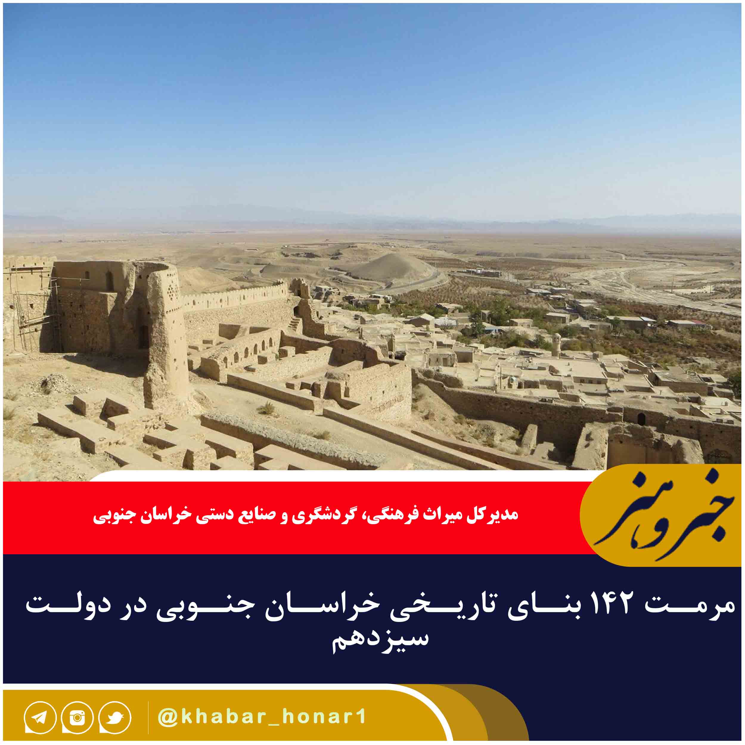 مدیرکل میراث فرهنگی، گردشگری و صنایع دستی خراسان جنوبی گفت: با توجه به ضرورت نگهداری و حفاظت از بناهای تاریخی که مورد تاکید رییس جمهور شهید نیز بود، در دولت سیزدهم ۱۴۲ بنای تاریخی استان مرمت شد.
