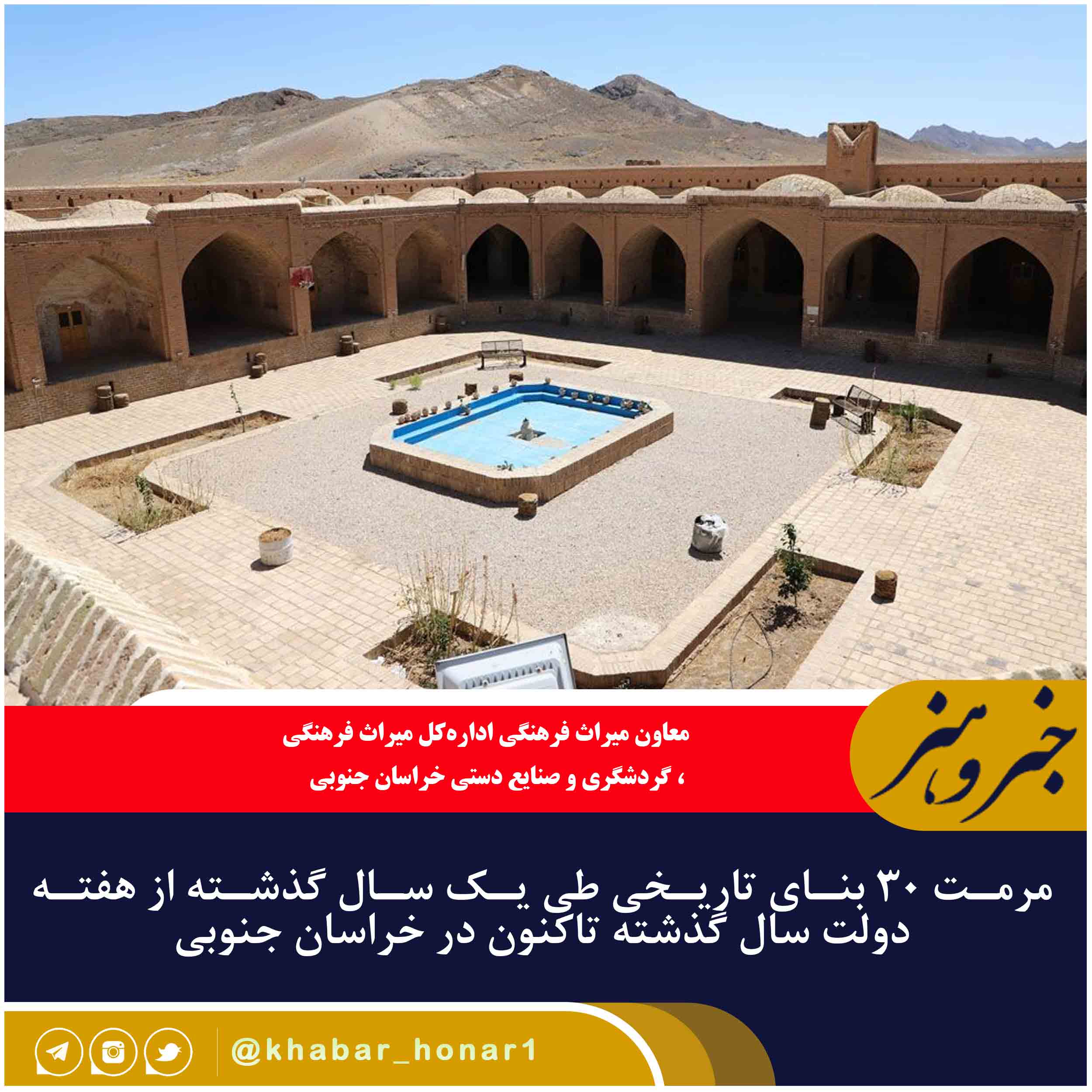 معاون میراث فرهنگی ادارهکل میراث فرهنگی، گردشگری و صنایع دستی خراسان جنوبی از مرمت ۳۰ بنای تاریخی طی یک سال گذشته (از هفته دولت سال گذشته تاکنون) در استان خبر داد.
