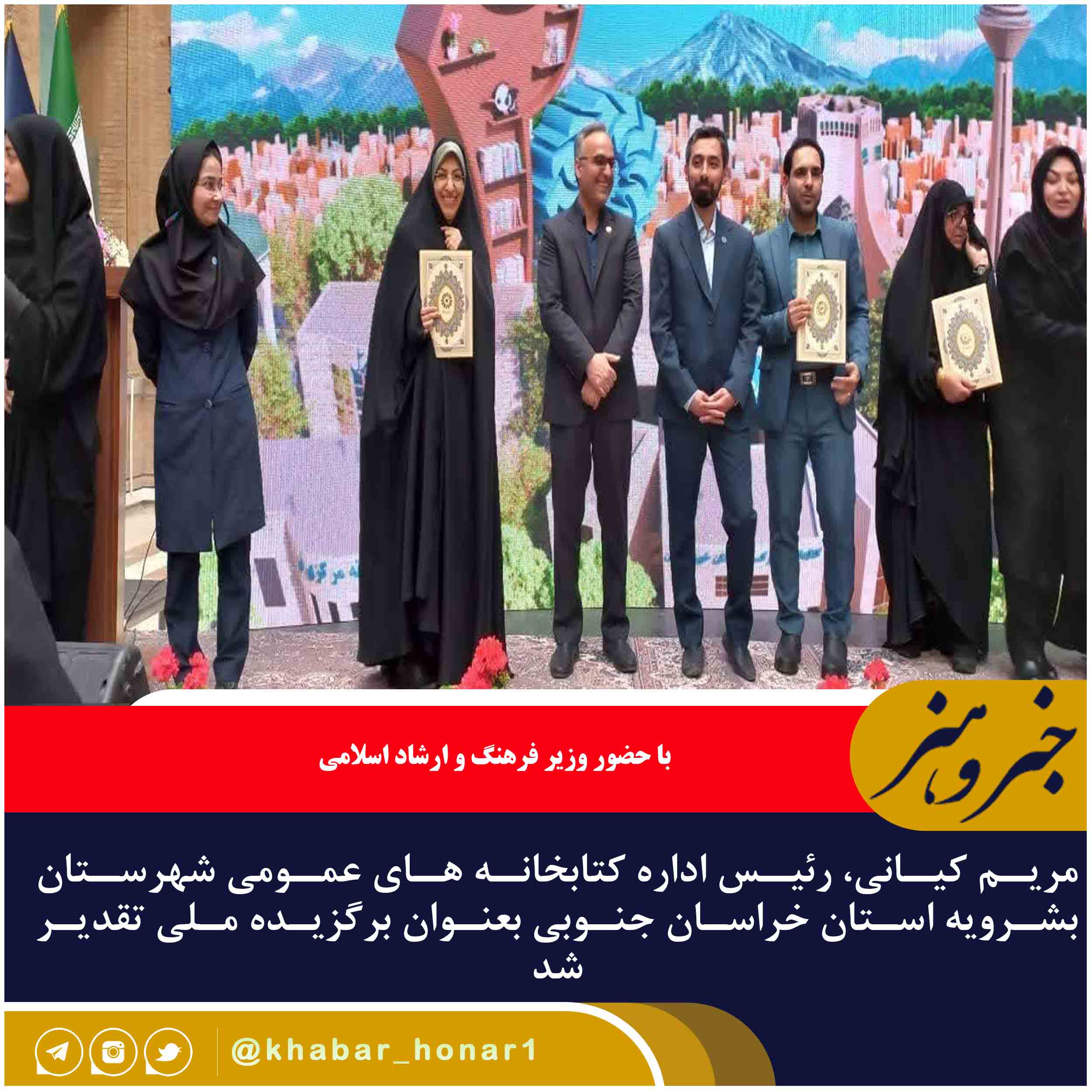 از خانم مریم کیانی، رئیس اداره کتابخانه های عمومی شهرستان بشرویه استان خراسان جنوبی بعنوان برگزیده ملی تقدیر شد همزمان با بیستمین سالروز تأسیس نهاد ۲۰ تن از متولیان کتاب در کشور برگزیده با حضور وزیر فرهنگ و ارشاد اسلامی، معرفی و تقدیر شدند.