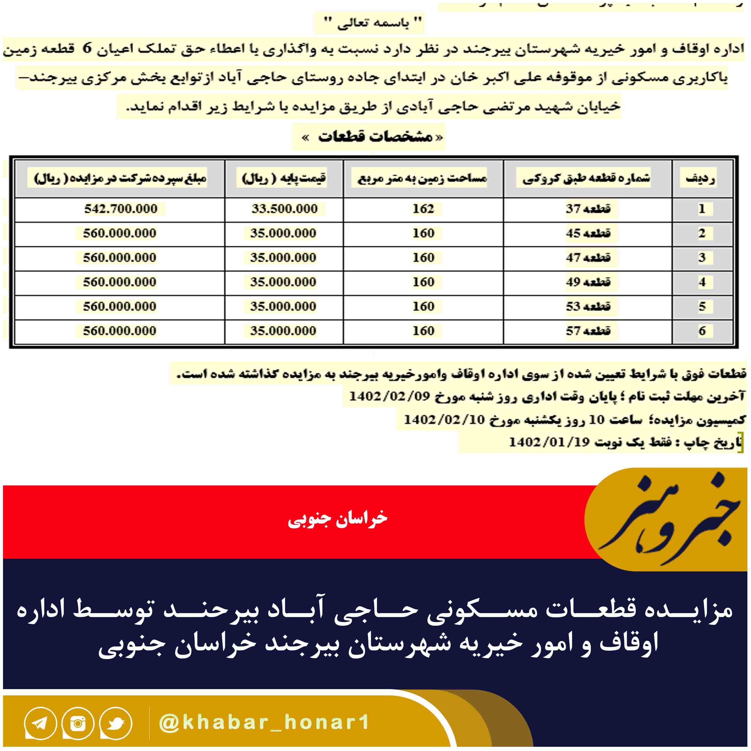 اداره اوقاف و امور خیریه شهرستان بیرجند در نظر دارد نسبت به واگذاری با اعطاء حق تملک اعیان ۶ قطعه زمین باکاربری مسکونی از موقوفه علی اکبر خان در ابتدای جاده روستای حاجی آباد ازتوابع بخش مرکزی بیرجند– خیابان شهید مرتضی حاجی آبادی از طریق مزایده با شرایط زیر اقدام نماید.
