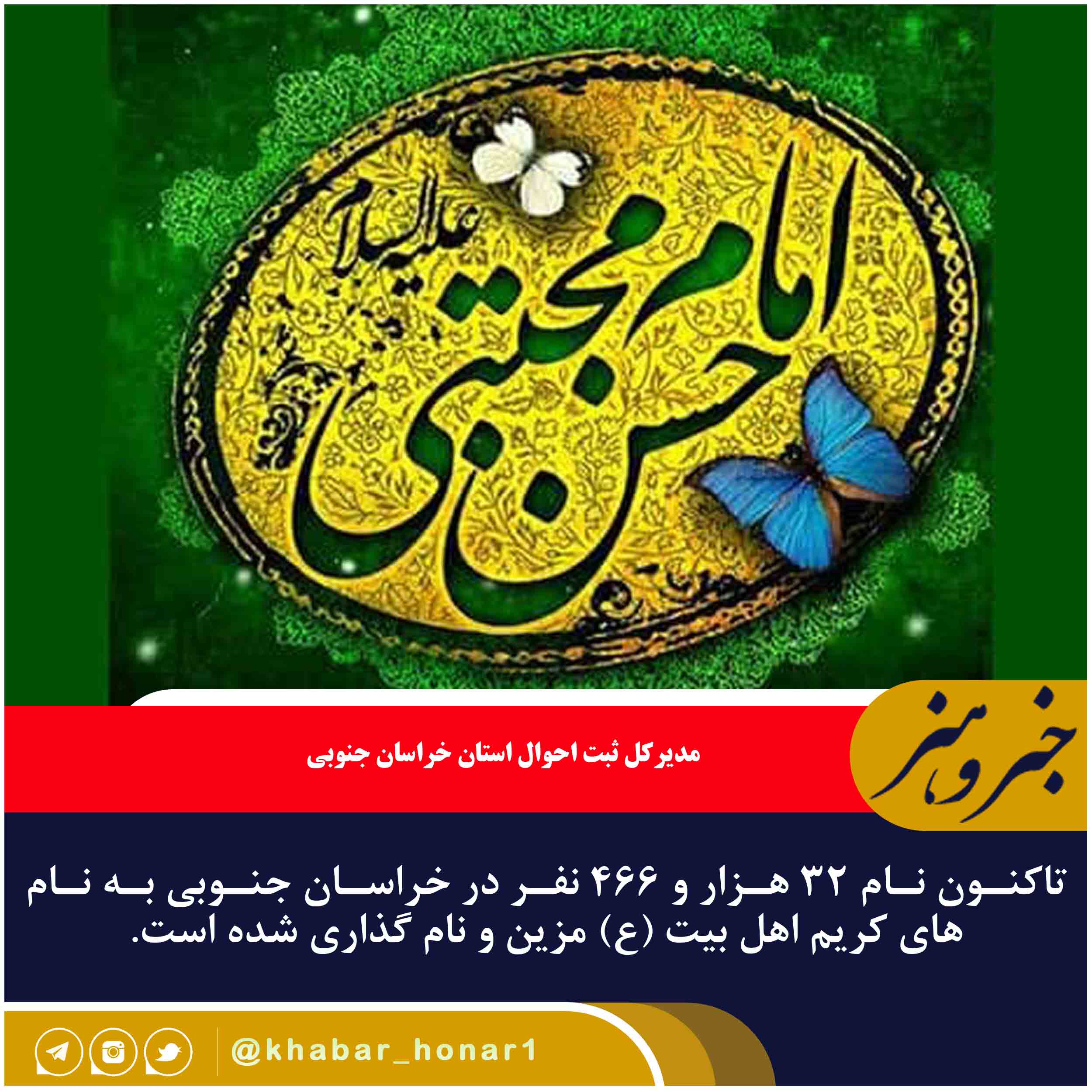 تاکنون نام ۳۲ هزار و ۴۶۶ نفر در خراسان جنوبی به نامهای کریم اهل بیت (ع) مزین و نام گذاری شده است.