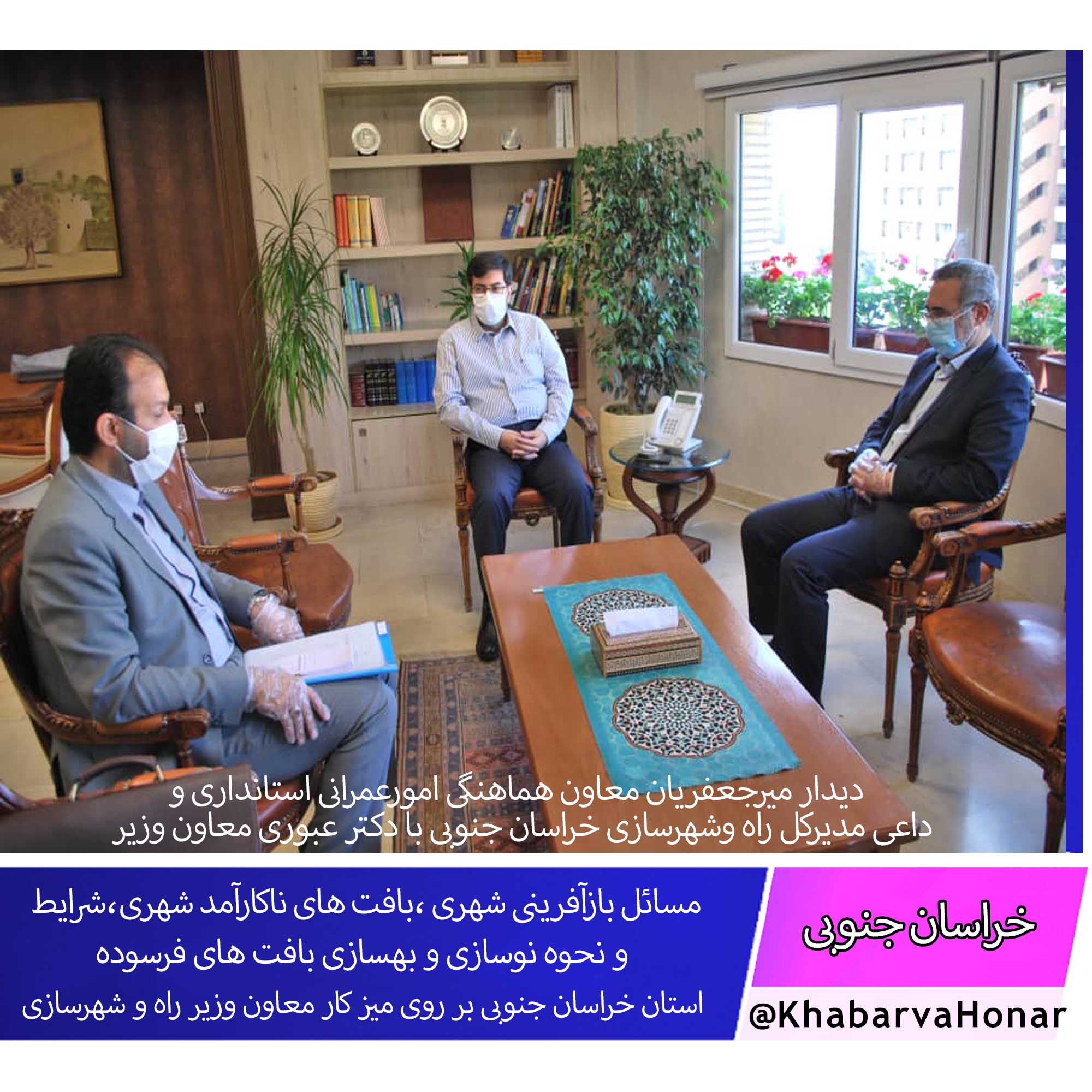 دیدار مهندس میرجعفریان معاون هماهنگی امورعمرانی استانداری ومهندس داعی مدیرکل راه وشهرسازی خراسان جنوبی با دکتر عبوری معاون وزیر و مدیرعامل شرکت بازآفرینی شهری ایران جهت بررسی پروژه های بازآفرینی شهری خراسان جنوبی