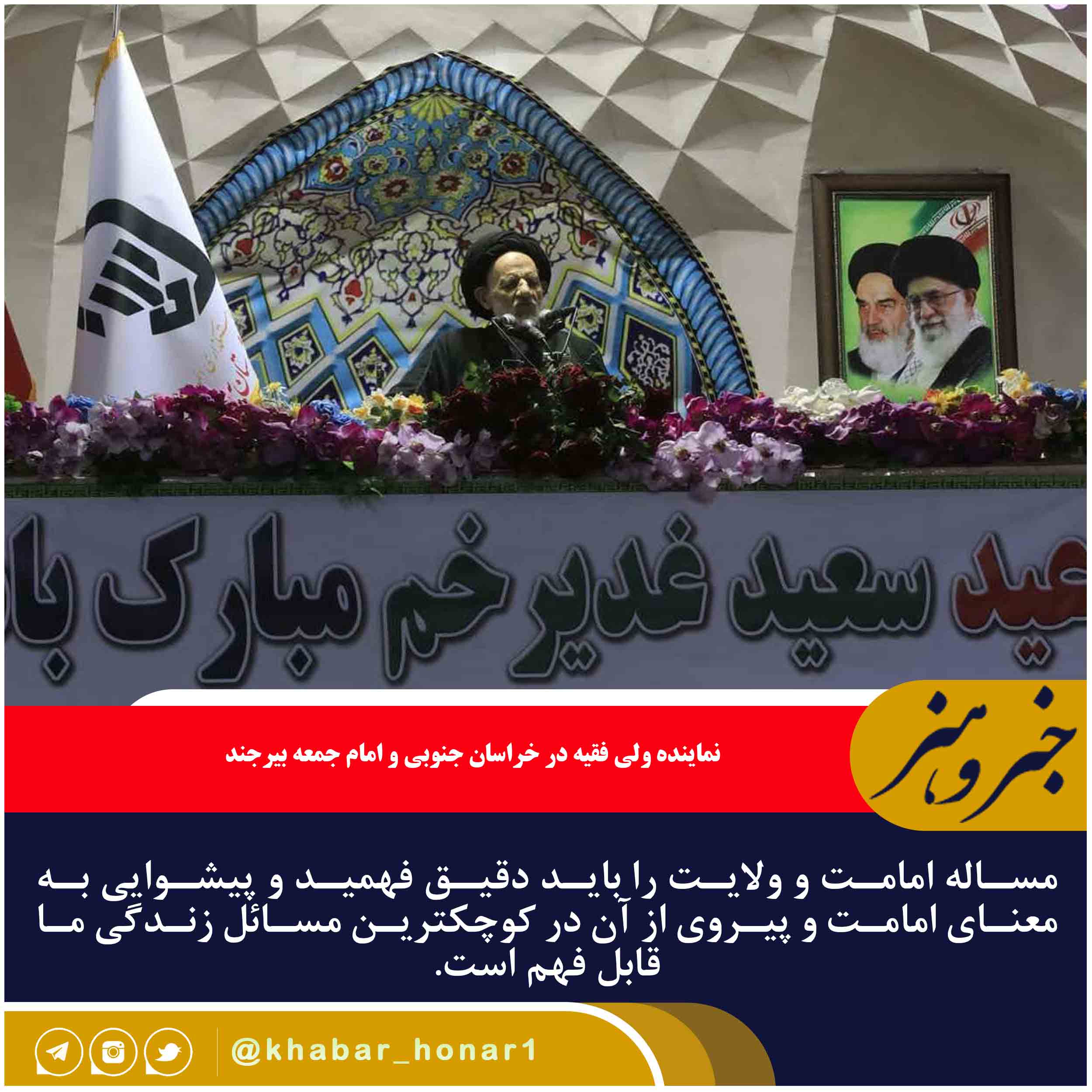 نماینده ولی فقیه در خراسان جنوبی و امام جمعه بیرجند گفت: مساله امامت و ولایت را باید دقیق فهمید و پیشوایی به معنای امامت و پیروی از آن در کوچکترین مسائل زندگی ما قابل فهم است.