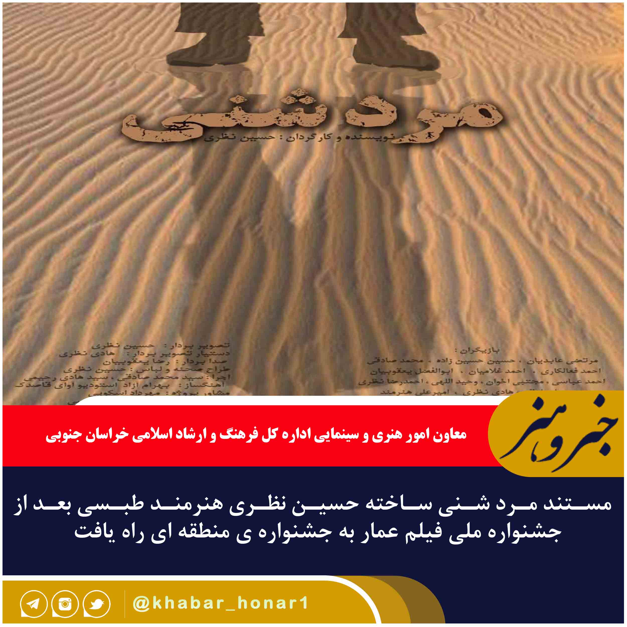 فیلم مستند مرد شنی بعد از حضور موفق در بخش رقابتی جشنواره فیلم عمار به جشنواره منطقه ای انجمن سینمای جوان ایران در استان یزد راه پیدا کرد.، سید علی زمزم؛ معاون امور هنری و سینمایی اداره کل فرهنگ و ارشاد اسلامی خراسان جنوبی گفت: فیلم مستند مرد شنی به کارگردانی حسین نظری از طبس و تهیه کنندگی انجمن سینمای جوانان دفتر بیرجند تولید و در بخش رقابتی جشنواره فیلم عمار که در سینما فلسطین تهران و به صورت مجازی به نمایش درآمد حضور یافت.