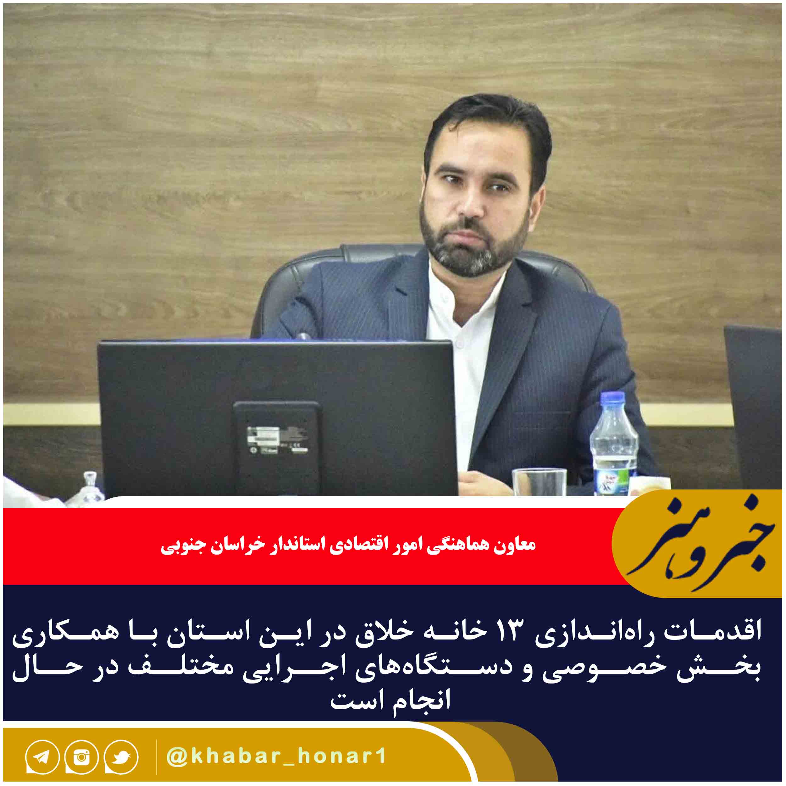 معاون هماهنگی امور اقتصادی استاندار خراسان جنوبی گفت: مقدمات راهاندازی ۱۳ خانه خلاق در این استان با همکاری بخش خصوصی و دستگاههای اجرایی مختلف در حال انجام است.