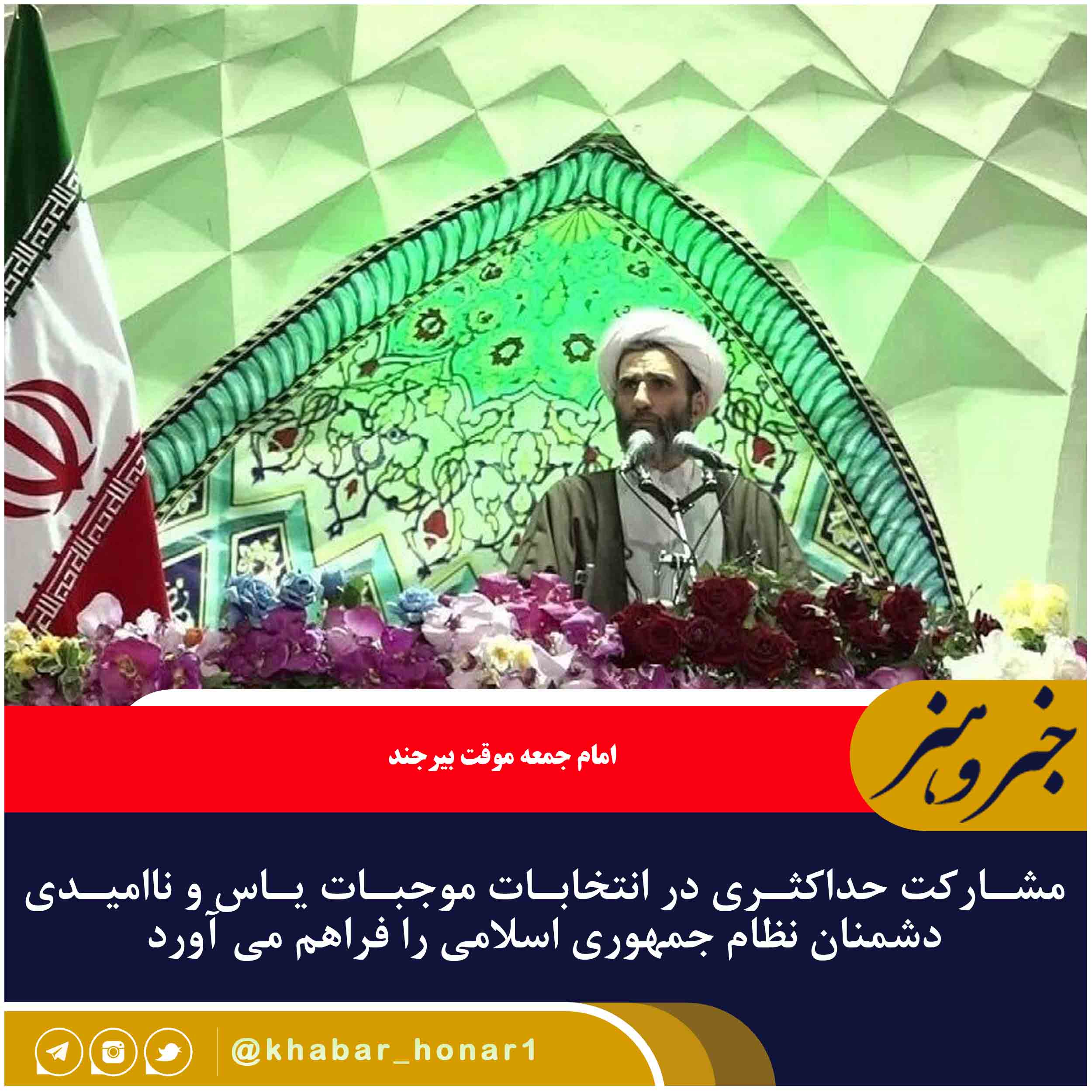 خطیب جمعه بیرجند با اشاره به انتخابات اسفند امسال و لزوم مشارکت حداکثری در آن گفت: مشارکت حداکثری در انتخابات موجبات یاس و ناامیدی دشمنان نظام جمهوری اسلامی را فراهم می آورد و باید این موضوع را جدی بگیریم.