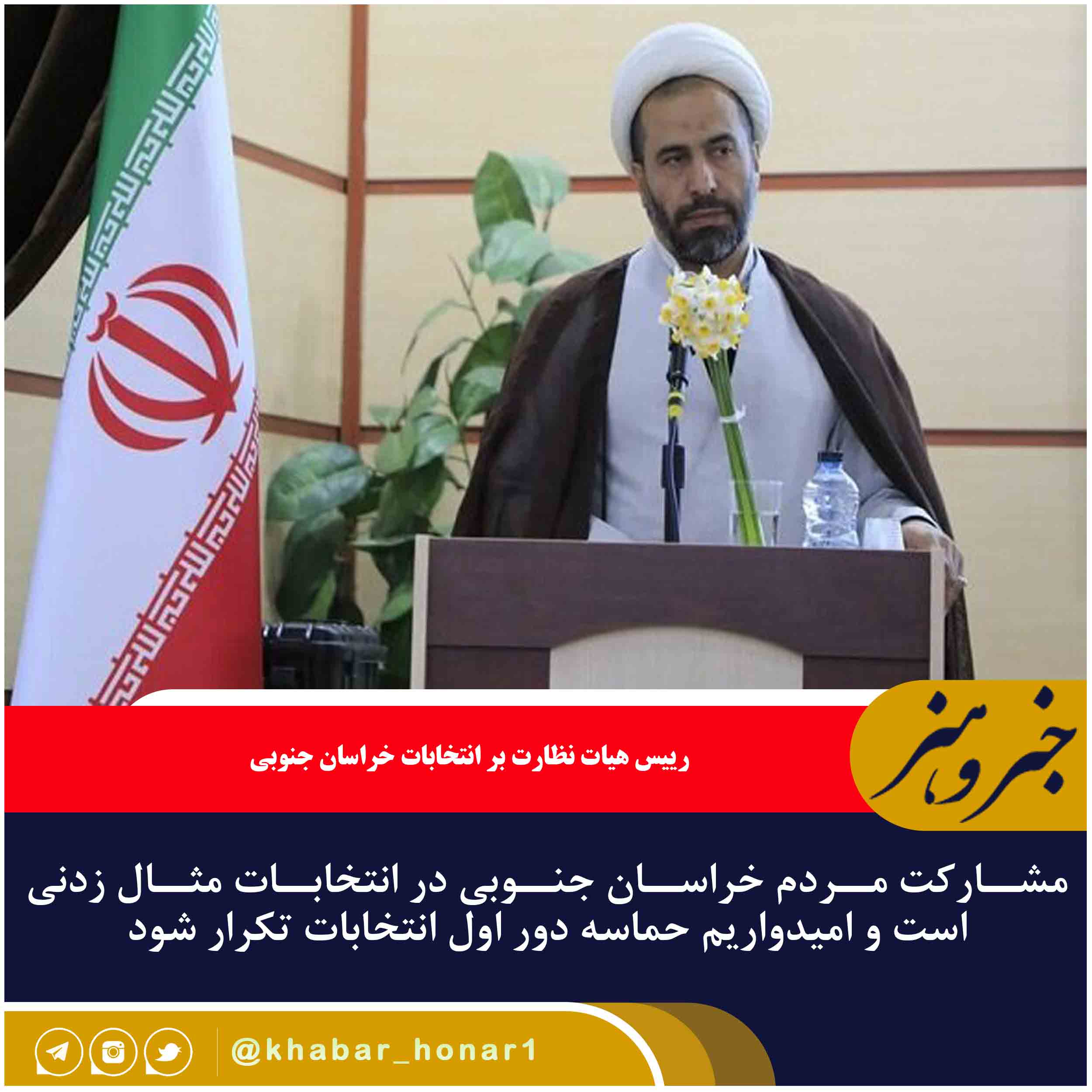 رییس هیات نظارت بر انتخابات خراسان جنوبی گفت: مشارکت مردم خراسان جنوبی در انتخابات مثال زدنی است و امیدواریم حماسه دور اول انتخابات تکرار شود.