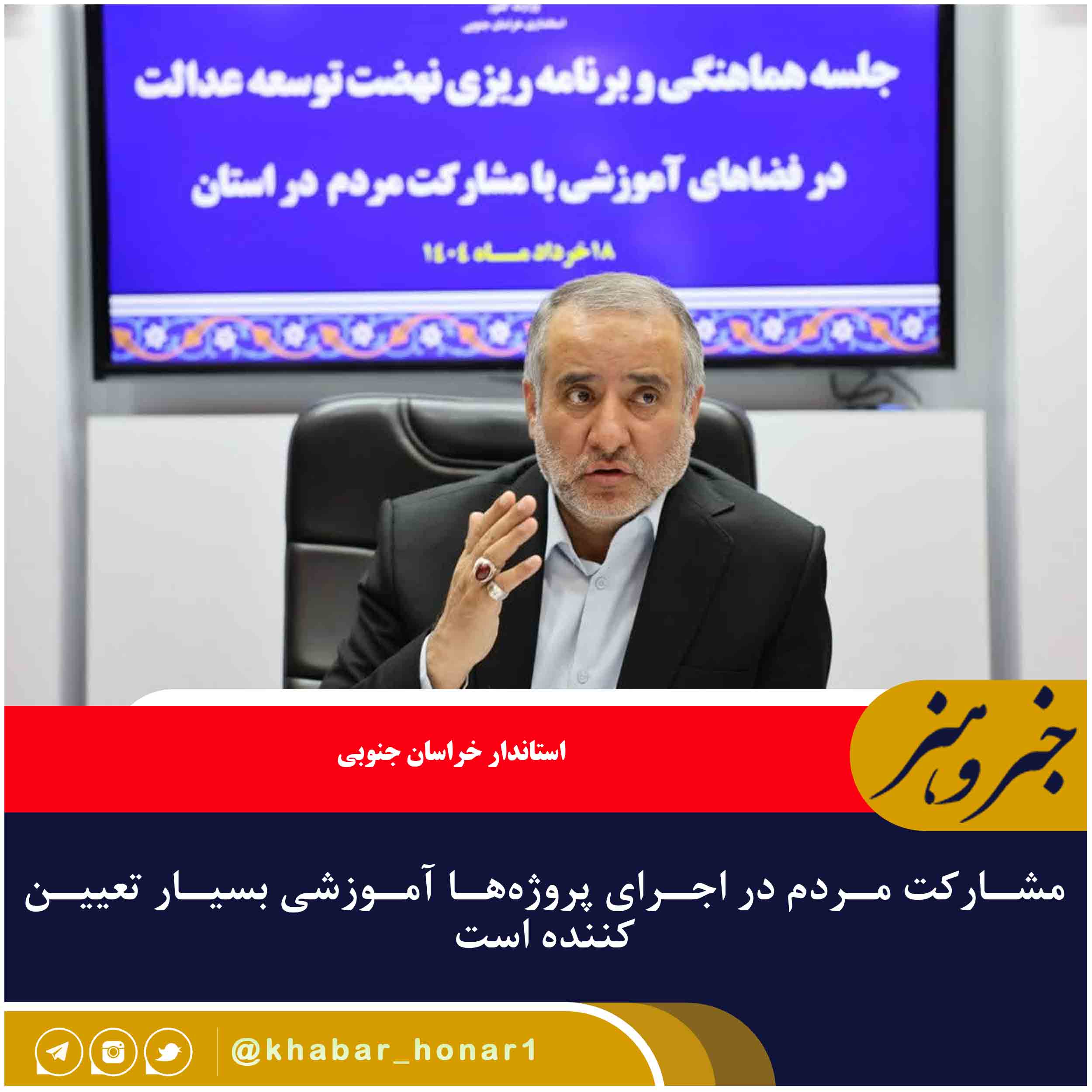 🔹استاندار خراسان جنوبی گفت: مشارکت مردم در اجرای پروژه‌ها بسیار تعیین‌کننده است.