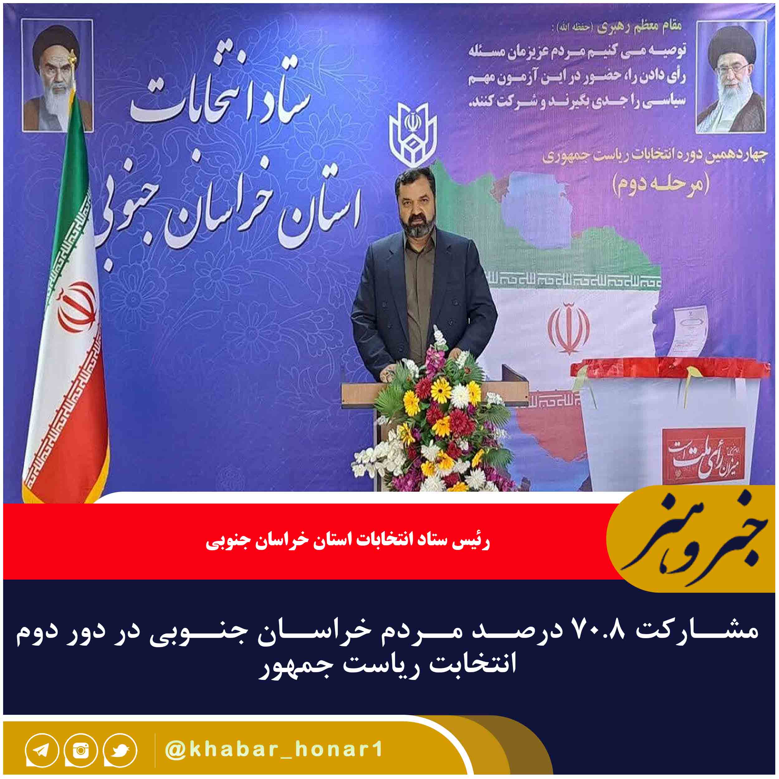 رئیس ستاد انتخابات استان خراسان جنوبی با اعلام نتایج مرحله دوم انتخابات چهاردهمین دوره ریاست جمهوری در این استان گفت: میزان مشارکت مردم استان در دور دوم انتخابات ۷۰.۰۸ درصد ثبت شد که نسبت به مرحله اول بیش از ۶ درصد افزایش دارد.
