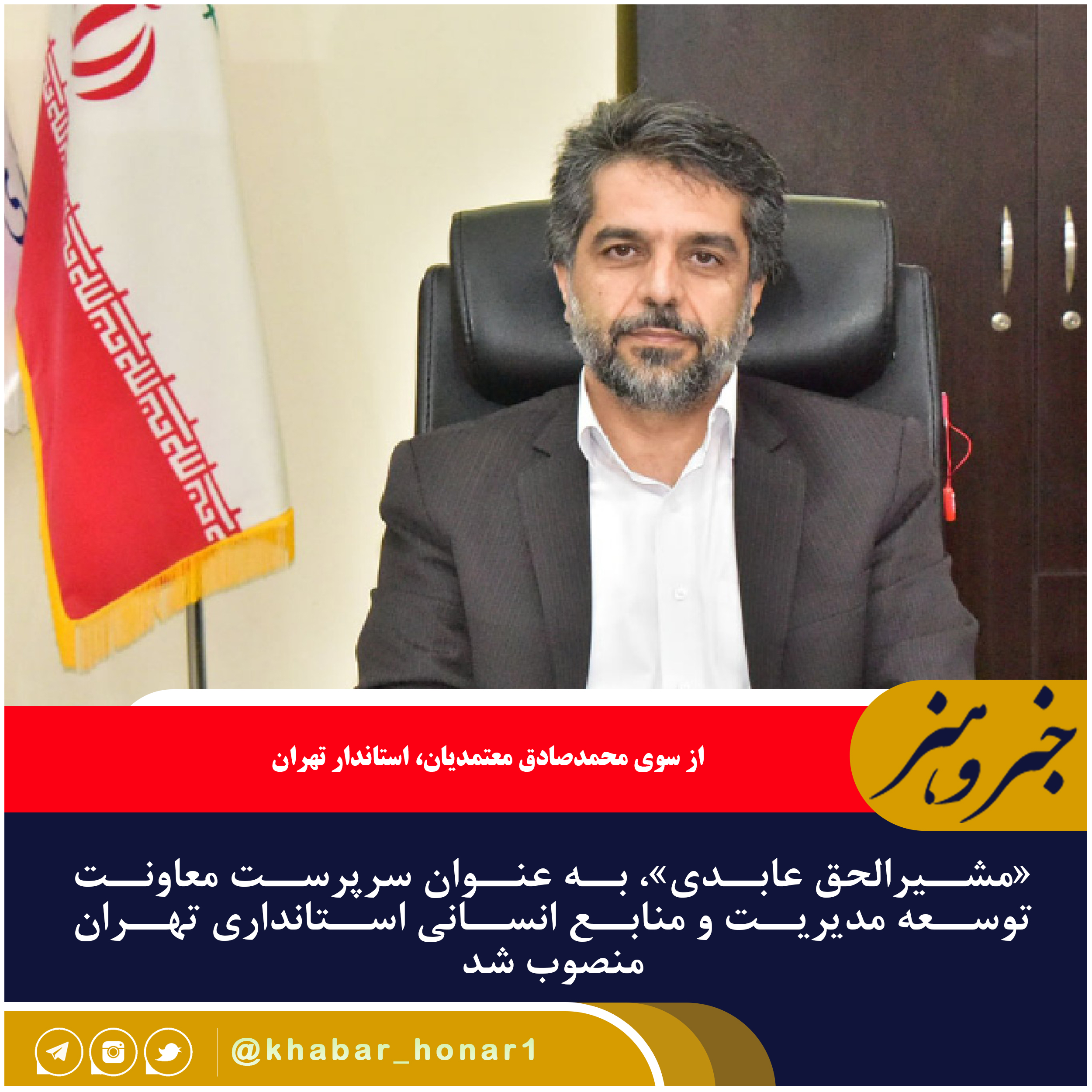 طی حکمی از سوی محمدصادق معتمدیان، استاندار تهران، «مشیرالحق عابدی»، به عنوان سرپرست معاونت توسعه مدیریت و منابع انسانی استانداری تهران منصوب شد.