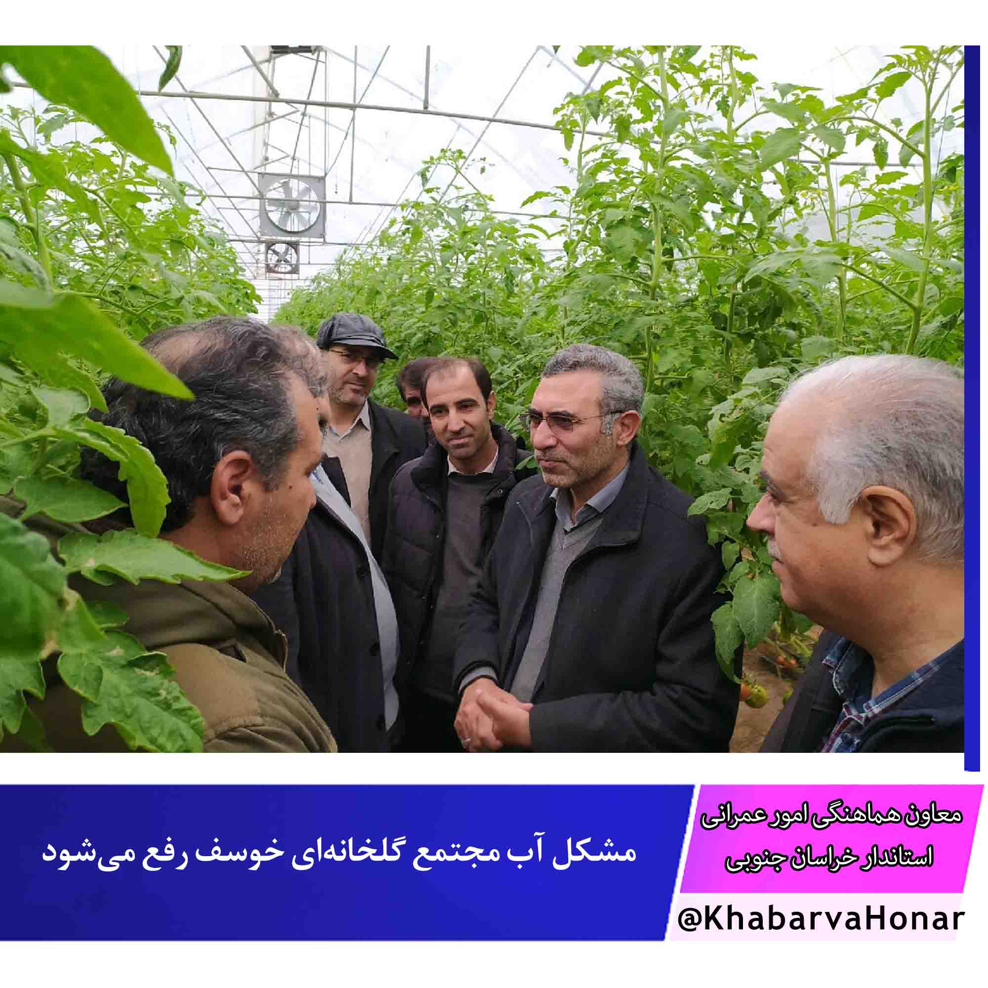 سید کمالالدین میرجعفریان روز یکشنبه در سفر به شهرستان خوسف به منظور بررسی مصوبات سفر استاندار به این شهرستان افزود: در راستای حل مشکل آب مجتمع گلخانهای شهرستان خوسف در سفری که ۲۶ مرداد امسال استاندار خراسان جنوبی به این شهرستان داشت مقرر شد شرکت آب منطقهای نسبت به افزایش دبی آب مجتمع به میزان پنج لیتر بر ثانیه اقدام کند.