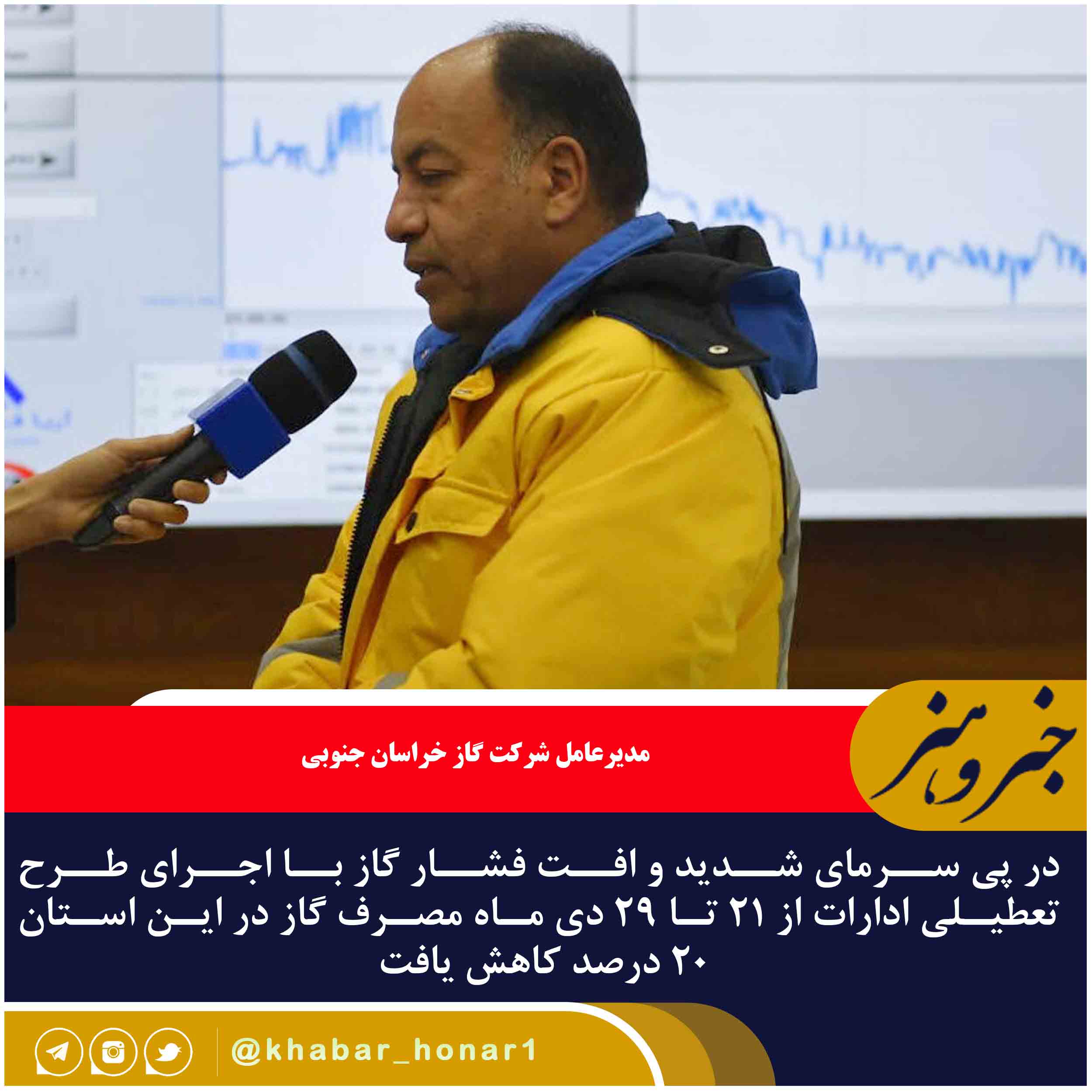 مدیرعامل شرکت گاز خراسان جنوبی گفت: در پی سرمای شدید و افت فشار گاز با اجرای طرح تعطیلی ادارات از ۲۱ تا ۲۹ دی ماه مصرف گاز در این استان ۲۰ درصد کاهش یافت.